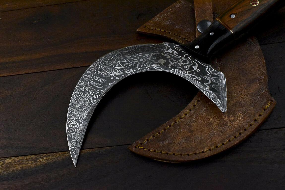 This Custom Handmade Damascus Steel Hunting Clever Chopper Axe Knife is a true masterpiece, designed to impress both collectors and outdoor enthusiasts. Crafted from Damascus steel, the blade is made by folding 1095 and 15N20 steel layers five times, producing approximately 288 layers for a stunning, high-performance pattern. The result is a blade that combines exceptional sharpness, durability, and edge retention with a 58–60 HRC Rockwell hardness.