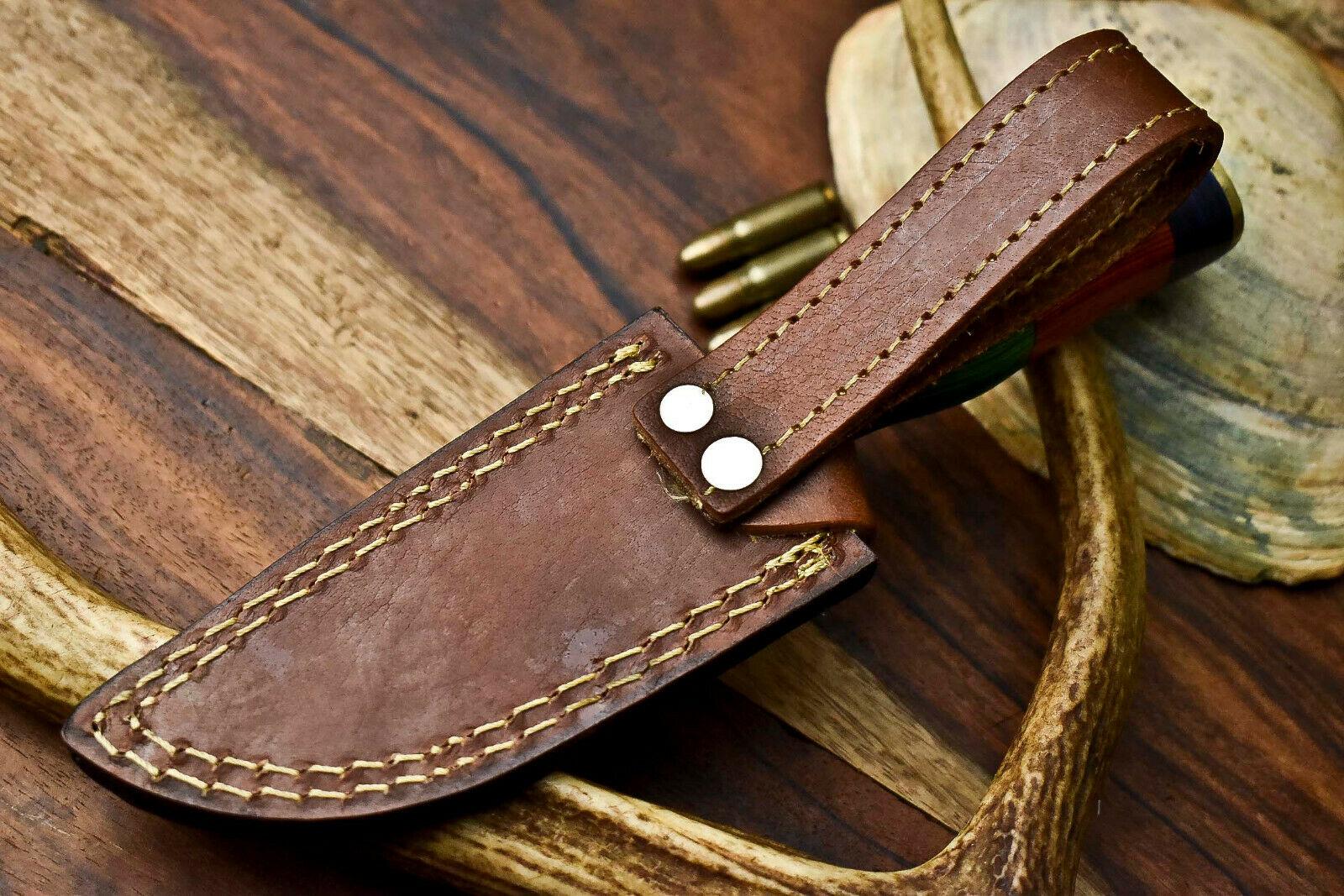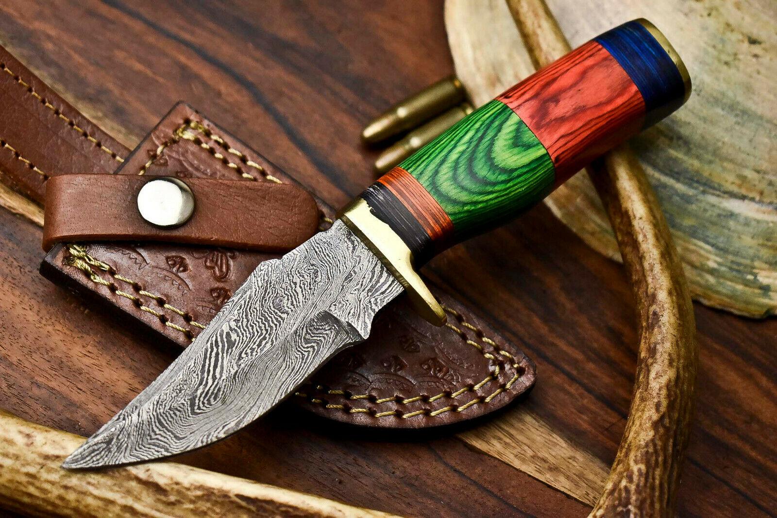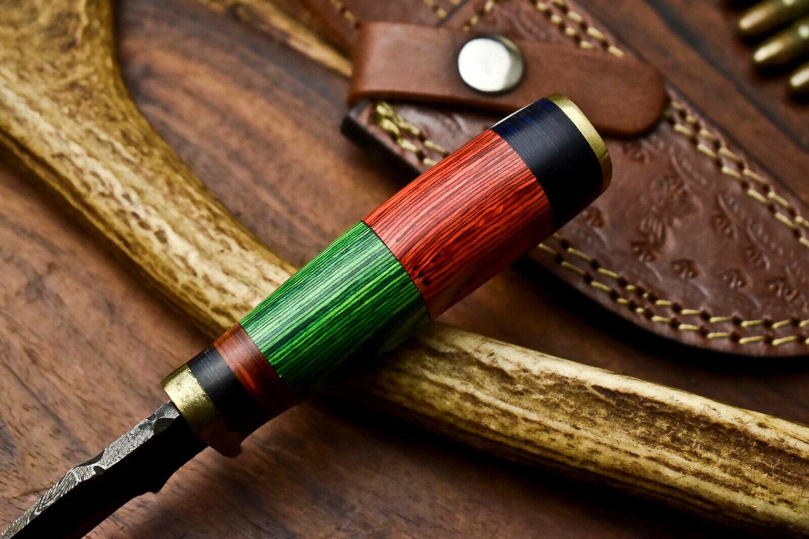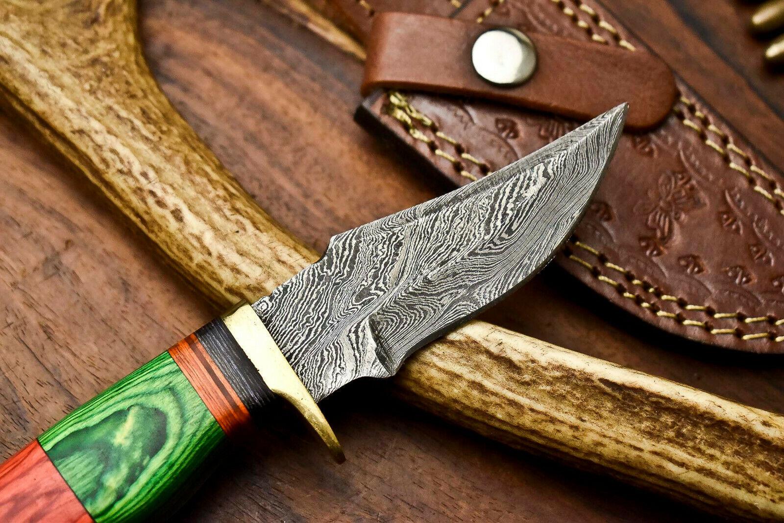 Custom Handmade Damascus Steel Hunting Knife with Hardwood Handle and Leather Sheath