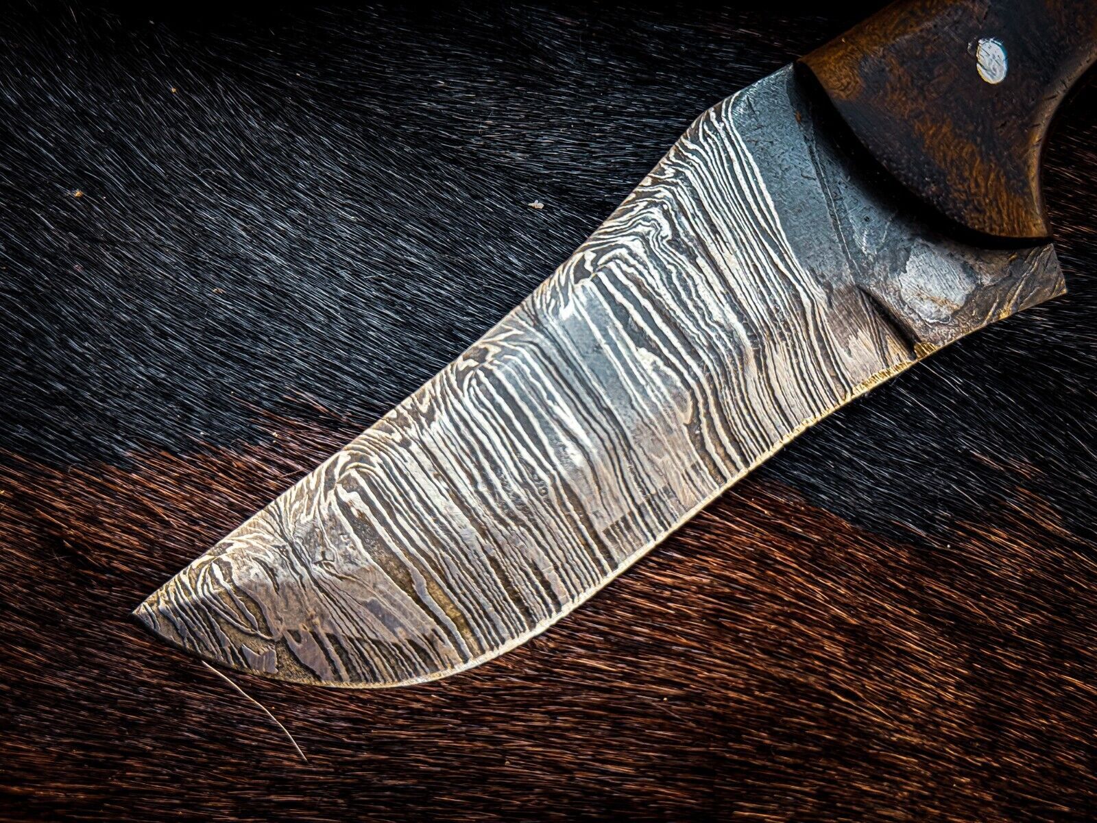 This custom handmade Damascus steel hunting skinner knife is crafted with precision, durability, and beauty in mind. Measuring approximately 9 inches in overall length, it features a 4.5-inch razor-sharp Damascus steel blade and a 4.5-inch ergonomic wood handle designed for a secure and comfortable grip. The blade is forged from high-quality Damascus steel, combining multiple layers of 1095 and 15N20 high carbon steels for exceptional strength, edge retention, and a striking pattern unique to each knife.
