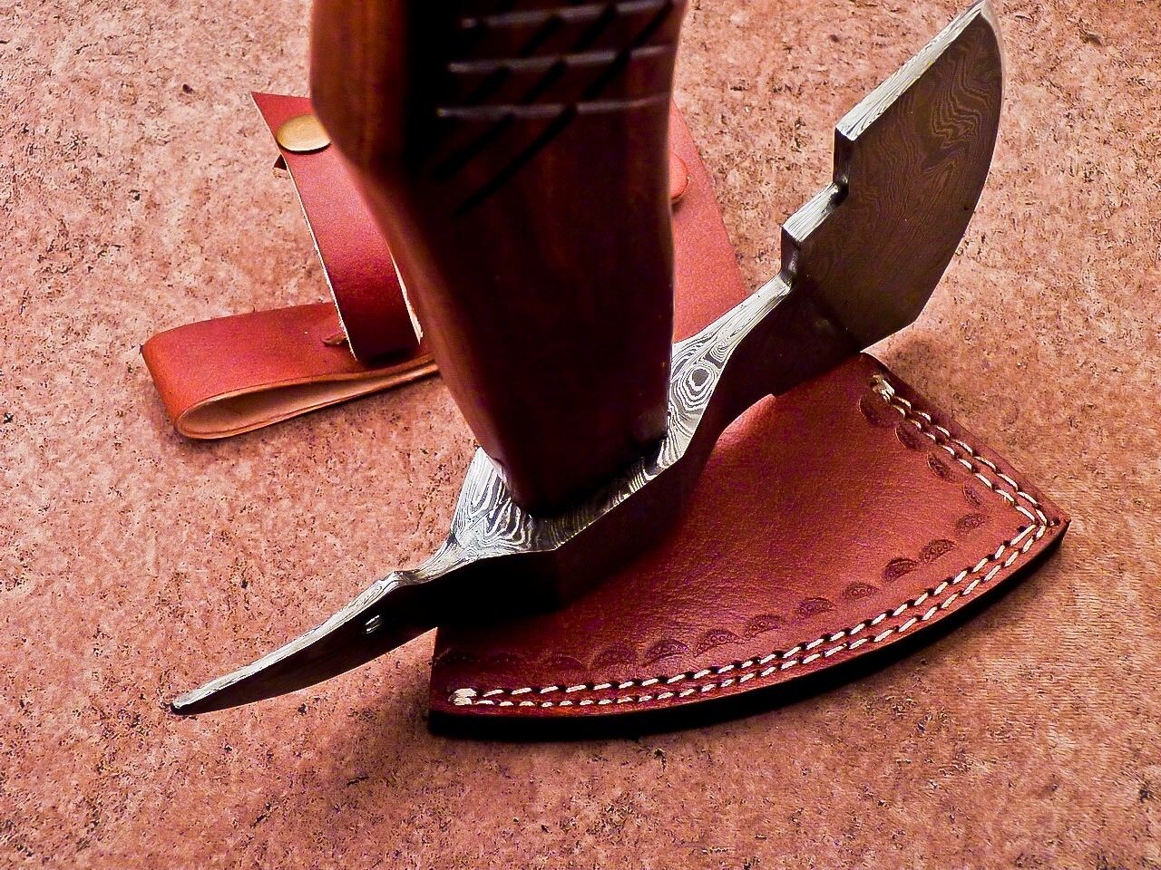 Experience the power and artistry of this custom handmade Damascus Axe, expertly forged from premium damascus steel axe for ultimate strength, durability, and visual appeal. This large damascus steel axe measures 22 inches overall, featuring a 5-inch blade length and a 9-inch blade width, paired with a 21-inch natural wood handle for superior balance and control. The damascus axe head is meticulously hand-forged from 1095 and 15N20 high steel layers, producing stunning flowing patterns that extend all the way to the edge. A saw-blade effect at the microscopic level ensures this damascus steel battle axe stays sharp longer than standard blades. Each handmade damascus axe is unique, making it perfect as a damascus bearded axe, damascus camp axe, or viking axe damascus collector’s item. It comes with a leather sheath for safe storage and transport. Slight variations in pattern give each piece its own character. Ideal for collectors, outdoor enthusiasts, or those seeking a damascus steel throwing axe, damascus viking bearded axe pendants, or damascus steel axe for sale, this handcrafted handmade damascus axe combines traditional forging with modern precision. A true blend of artistry, functionality, and timeless design, it is both practical and a stunning display piece.