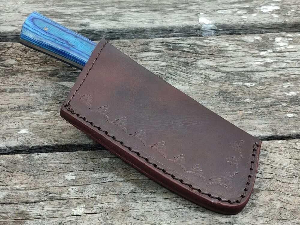Each hand forged Damascus axe undergoes a precise heat treatment process to ensure excellent hardness and edge retention, making it reliable for hunting, camping, or skinning tasks. The stain wood handle is polished to perfection, offering a comfortable and secure grip for extended use. No two blades are ever identical, guaranteeing a truly unique collectible piece. Complete with a handcrafted leather sheath, this mini Damascus axe is ready for safe storage and easy carrying. Whether used as a Damascus hunting axe, skinner knife, or collectible display item, this piece represents the perfect balance of craftsmanship, tradition, and performance. A must-have for those seeking a genuine Damascus axe for sale.