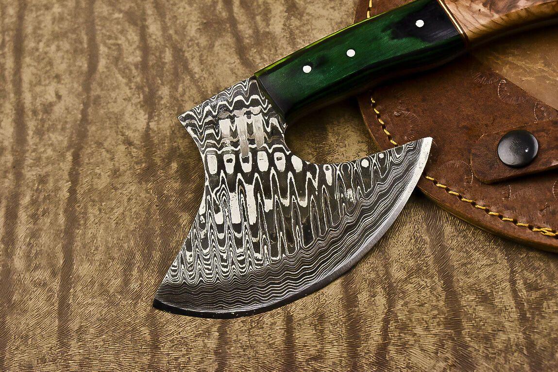 Custom Handmade Damascus Steel Olive Wood Hunting Clever Chopper Axe Knife with Leather Sheath