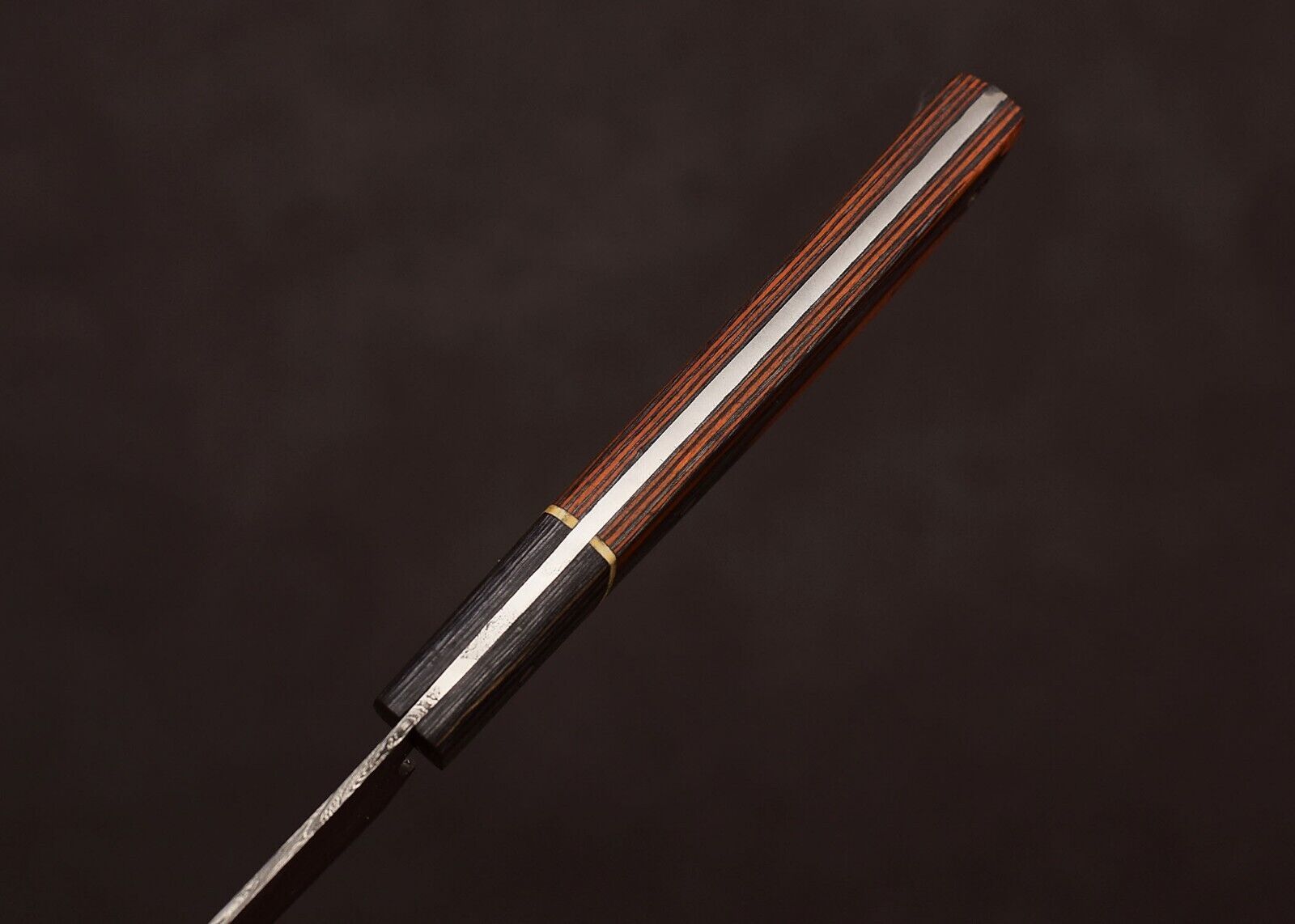 The 5-inch Pakka wood handle with a sturdy wood bolster ensures a secure, comfortable grip for both kitchen and outdoor use. Perfect as a chef knife, hunting knife, camping knife, survival tool, or collectible piece.