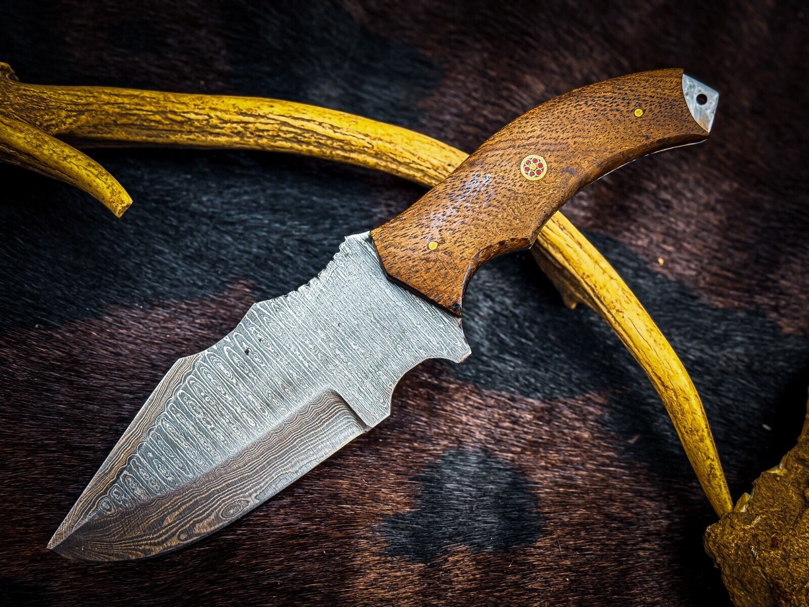 Custom Handmade Damascus Steel Skinner Knife with D2 Blade and Wood Handle