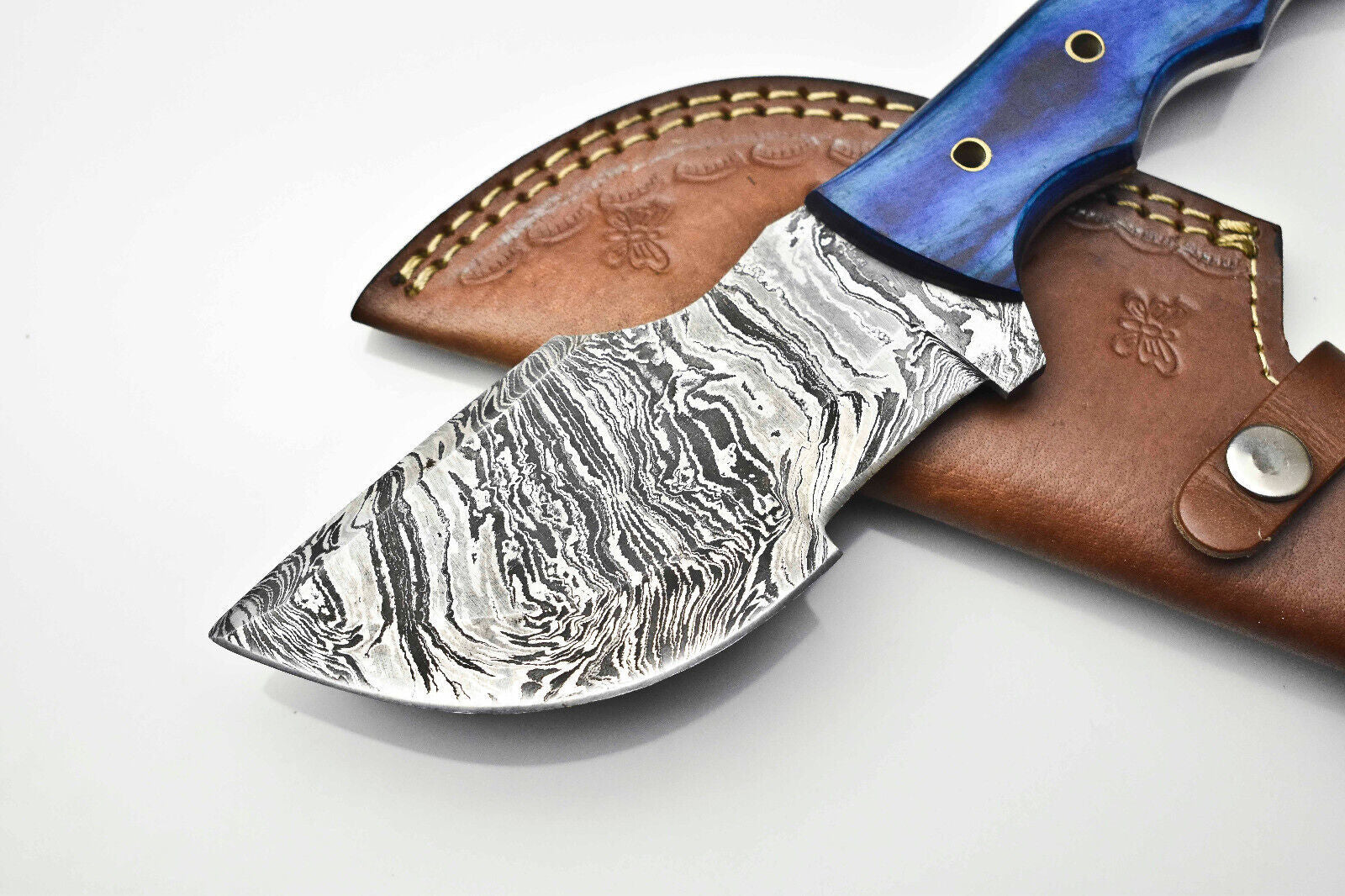 This Custom Handmade Damascus Steel Tracker Knife is a beautifully crafted blade built for strength, precision, and durability. With an overall length of 10 inches, including a 5-inch razor-sharp Damascus steel blade and a 5-inch polished hardwood handle, this knife is perfectly balanced for outdoor, hunting, and survival use. The blade is oil tempered to 58–60 HRC and features edges sharpened at 20 degrees, ensuring excellent cutting performance and long-lasting sharpness. Forged from a blend of 1095 high carbon steel and 15N20 nickel steel, the steel is folded repeatedly to create a striking 384-layer Damascus pattern. An acid etching process reveals the natural contrast between the metals, producing the unique wave-like designs Damascus steel is known for.The ergonomic hardwood handle is hand-polished for a secure grip and refined look, while the full tang construction guarantees superior durability and balance. Every knife comes with a high-quality cowhide leather sheath, designed for safe storage and easy carry. Each piece is 100% handmade, making it not just a functional outdoor tool but also a collector’s item that represents true craftsmanship.