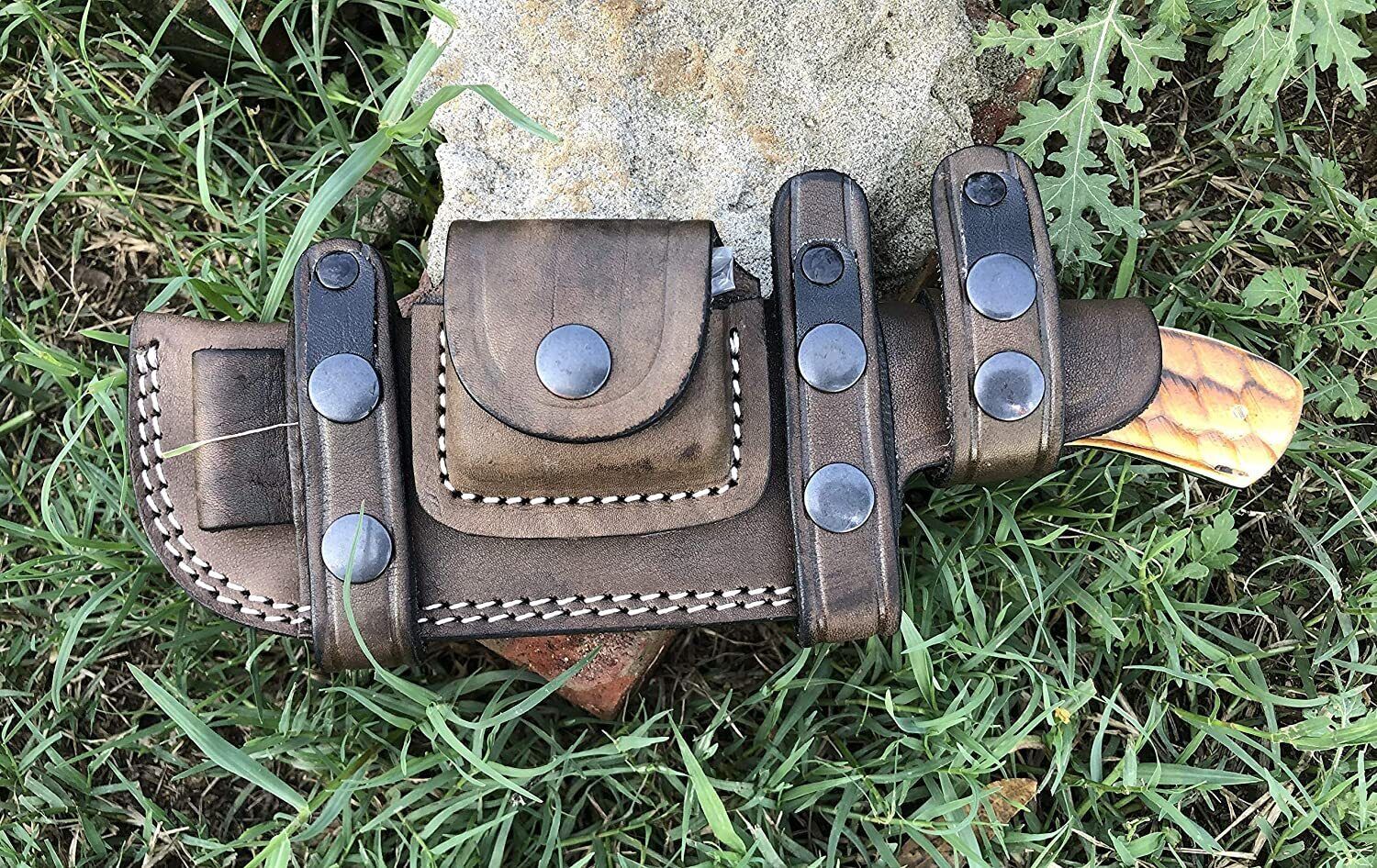This custom handmade Damascus tracker knife is a premium blend of strength, craftsmanship, and functionality, making it perfect for hunting, camping, tactical use, and outdoor survival. With an overall length of approximately 10 inches, the knife features a 5-inch hand-forged Damascus steel blade known for its durability, edge retention, and striking layered patterns. The full tang construction ensures maximum strength, while the 5-inch polished bone handle offers a comfortable and secure grip. Included with this knife is a specially designed cow or buffalo-hide leather sheath, handmade with premium saddle leather for long-lasting durability. Designed for horizontal scout carry on a belt or strap, it allows for easy and convenient access, making it an ideal choice for field use. Whether used as a dependable outdoor tool or kept as a decorative collector’s piece, this Damascus tracker knife is built to impress with its balance of practicality and artistry.