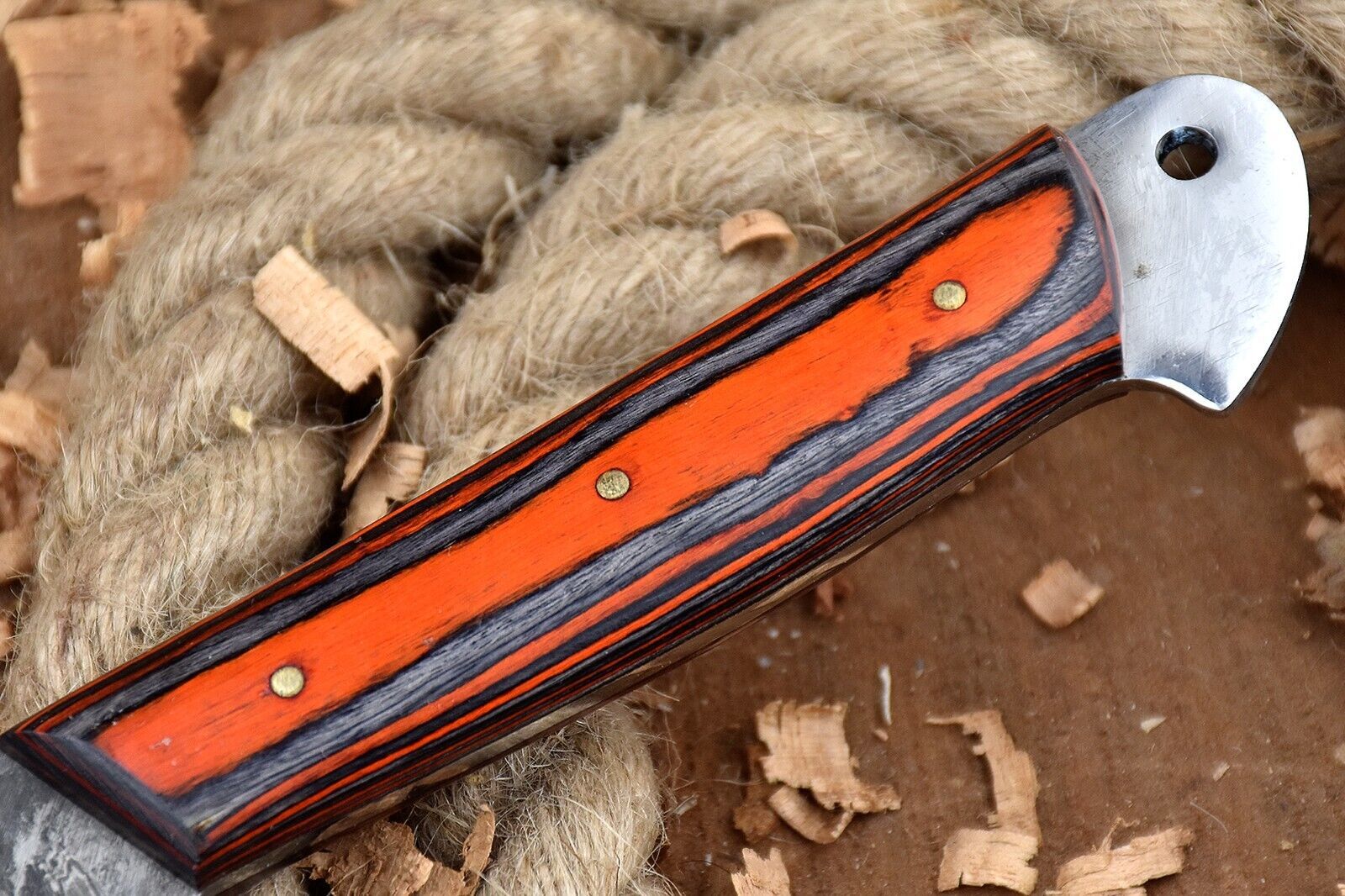 This Custom Handmade Forged Damascus Steel Kitchen Chef Cleaver Knife is expertly hand-forged for durability, precision, and professional performance. Measuring 11 inches overall, with a 6-inch blade, 5-inch handle, and approximately 4 mm thick blade, it is designed for chopping, slicing, and dicing with ease. The handle features a striking black and orange dollar sheet with an open tang design for strength and elegance. Each knife comes with a high-quality leather sheath that can be worn on a belt for safe storage and portability. Crafted from premium Damascus steel, this cleaver is custom made for you. We also offer blades in high carbon steel, 1095, 440C, J2, D2 tool steel, Baring steel, Spring steel, and ATS-34 stainless steel, maintaining the highest quality standards. Bring your imagination to life with a fully customized knife tailored to your specifications.