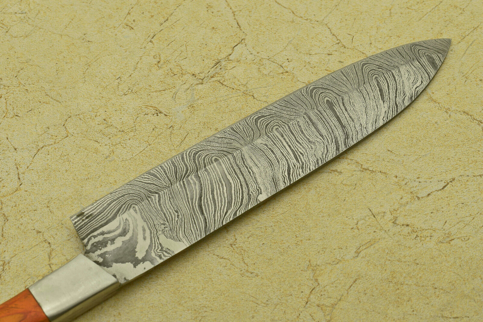This custom handmade forged Damascus steel chef kitchen knife is a true masterpiece, combining elegance with exceptional performance. The blade is meticulously hand-forged from 1095 and 15N20 high carbon steel, featuring 512 true layers that create a mesmerizing pattern and a microscopic saw-blade effect for long-lasting sharpness. With a robust 4 mm thick blade, excellent heat treatment, and a Rockwell hardness of 54 along the edge and 42–45 along the spine, this knife delivers outstanding durability and cutting power. The overall length is 11.75 inches, with a 7.50-inch blade and a 4.25-inch handle crafted from premium Pakka wood, secured with brass pins and high-strength epoxy for lifetime reliability. A hand-casted brass bolster adds both strength and elegance, making it perfect for professional chefs, home cooks, or collectors.