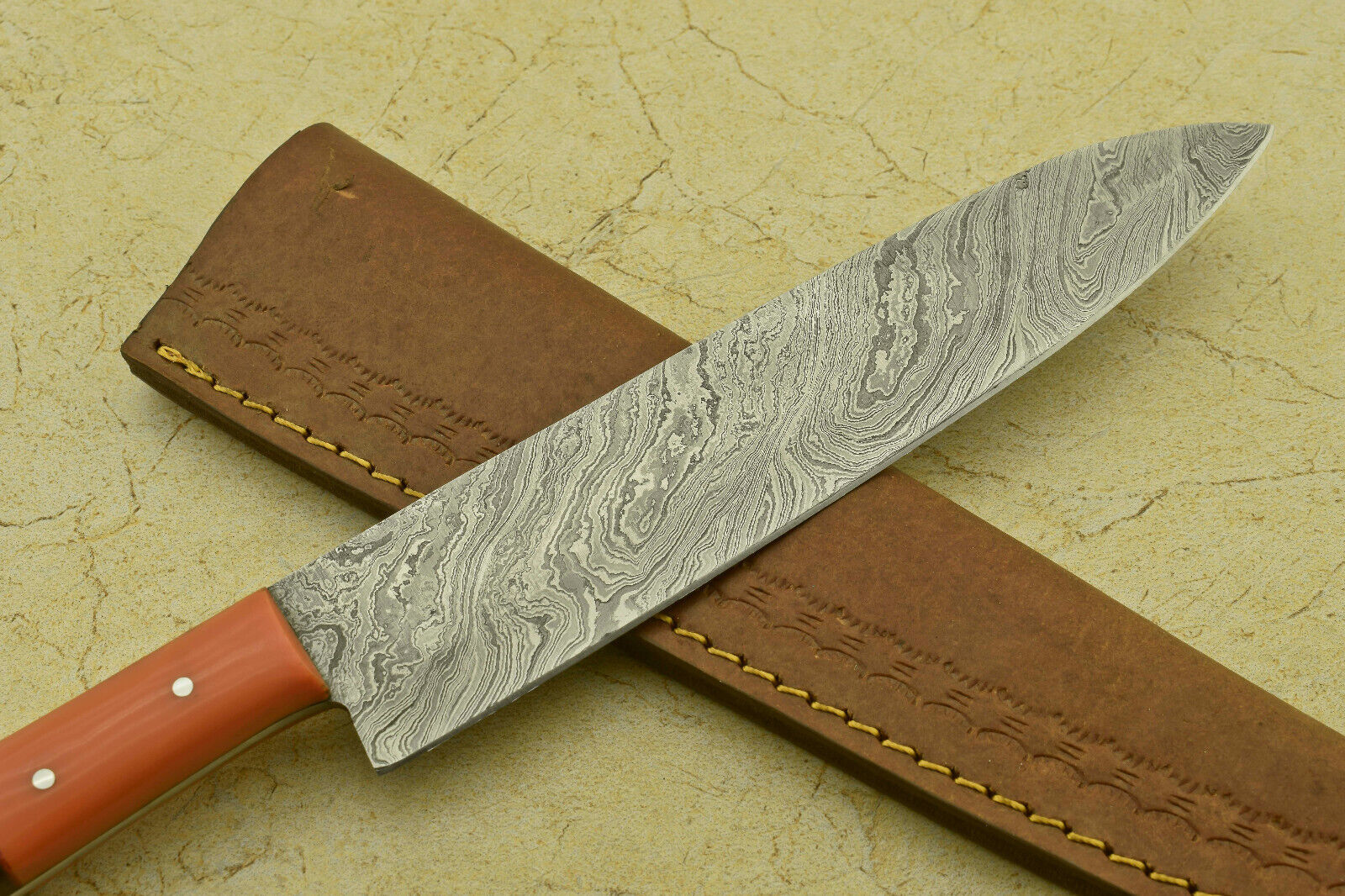 This stunning custom handmade chef knife features a hand-forged Damascus steel blade crafted from 512 true layers of 1095 and 15N20 high carbon steel. With an overall length of 12.25", including a 7.75" blade and a 4.50" resin and rosewood handle, this knife balances beauty and performance perfectly. The 4mm thick blade is meticulously ground on both sides, with a false edge on the top side, showcasing the intricate Damascus pattern flowing all the way to the razor-sharp edge.Thanks to expert heat treatment, the blade achieves a Rockwell hardness of 54 along the cutting edge and 42-45 along the spine, ensuring durability and long-lasting sharpness. The unique saw-blade effect at a microscopic level keeps the knife cutting efficiently while others dull. The elegant handle combines resin and rosewood scales, secured with brass pins and strong epoxy for lifetime durability and a comfortable grip.