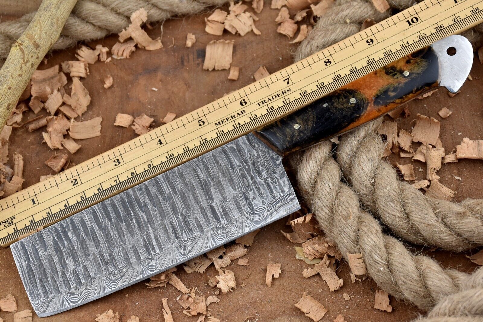 This exceptional kitchen chef cleaver knife is fully handmade and hand forged to ensure precision, durability, and aesthetic beauty. The knife has an overall length of 11 inches, with a 6-inch blade and 5-inch handle, and a blade thickness of approximately 4 mm for robust performance. The handle is crafted from a stunning black and orange raisin sheet with an open tang design, offering a secure and comfortable grip. A high-quality thick leather sheath is included, designed to be worn on the belt for convenience. Our blades are made from premium Damascus steel and are fully customizable. We also produce knives in high carbon steel, 1095, 440C, J2 steel, D2 tool steel, Baring steel, Spring steel, and ATS 34 stainless steel. You can choose the knife type, handle material, and additional features, or provide your design idea, which we will transform into a fully functional, handcrafted knife.