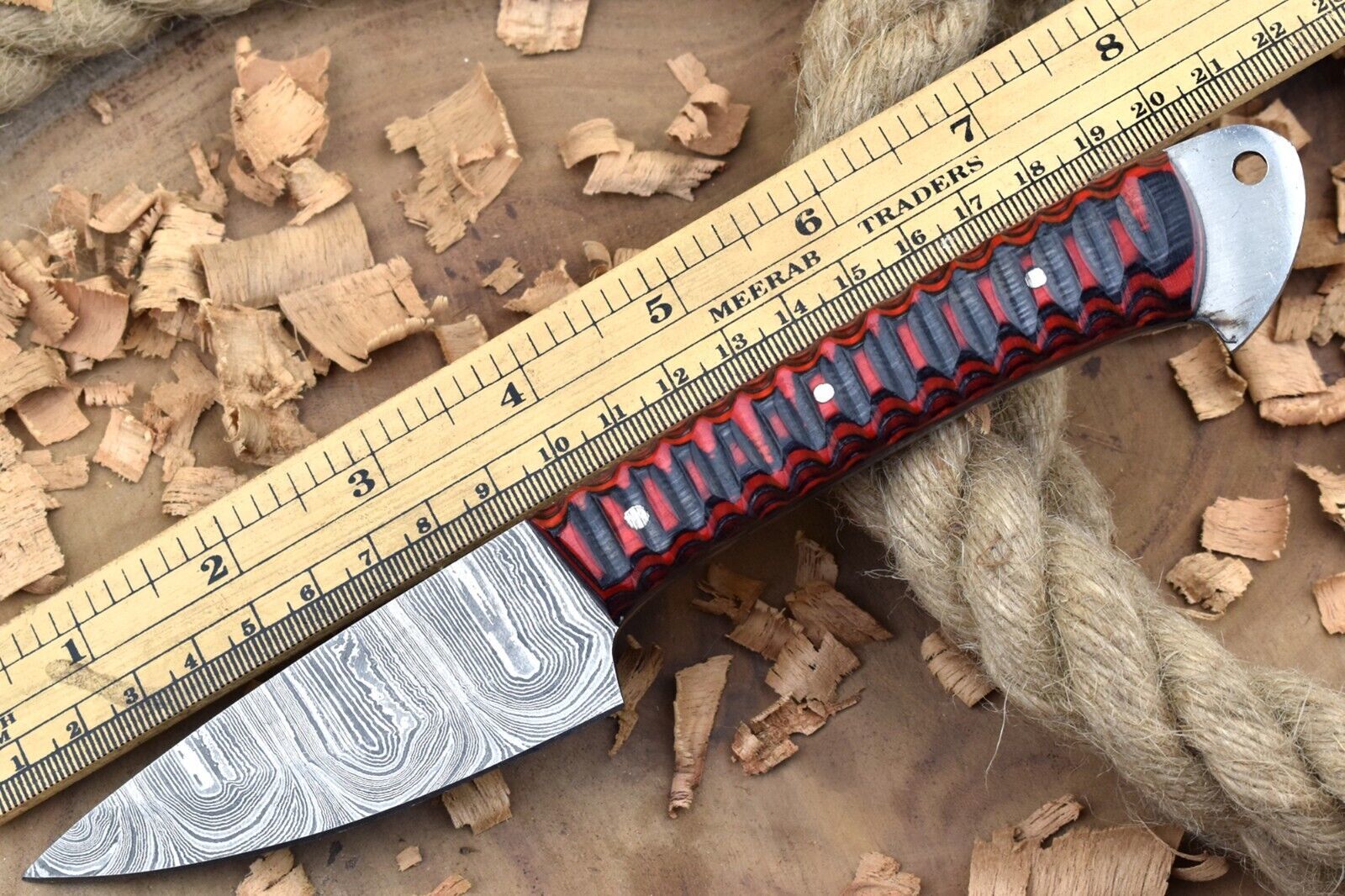 The razor-sharp Damascus steel blade is crafted with care, featuring a striking layered pattern that ensures durability and excellent edge retention. The ergonomic red and black dollar sheet handle with Sturl open tang design provides a secure, comfortable grip for precision cutting.