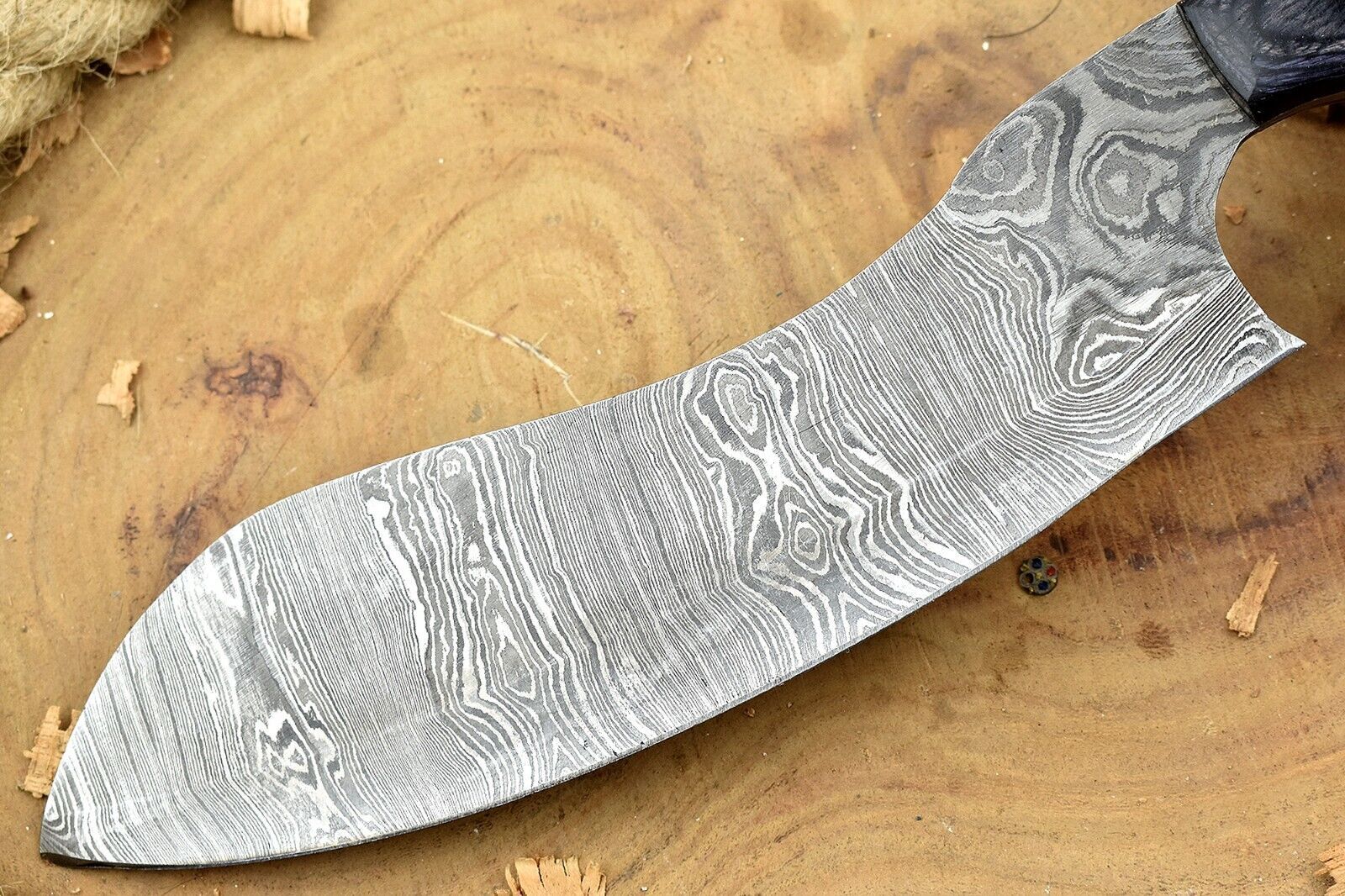 This custom handmade Damascus steel kitchen chef knife by Heritage Forge is a true example of skilled craftsmanship and durability. With an overall length of approximately 12 inches, this knife features a 7.5-inch blade made from premium Damascus steel and a 4.5-inch handle crafted with a stunning black dollar sheet for a sleek and elegant finish. The blade, forged from multiple layers of high-quality steel, showcases a distinctive Damascus pattern that not only enhances its beauty but also provides excellent strength, edge retention, and precision sharpness. The 2.5 mm thick blade ensures durability and versatility, making it ideal for slicing, chopping, and dicing a variety of ingredients. Hand forged with attention to detail, this knife is not only a highly functional kitchen tool but also a unique collectible for chefs and enthusiasts alike. Heritage Forge knives are designed to bring together performance, style, and tradition in every cut.