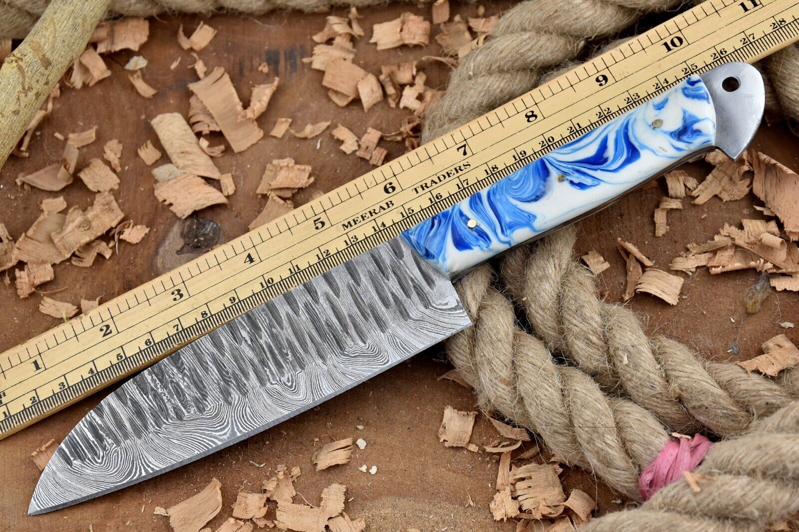 This Custom Handmade Forged Damascus Steel Kitchen Chef Knife is a true blend of craftsmanship and functionality. Measuring 11 inches overall, with a 6-inch blade, 5-inch handle, and approximately 4 mm thick blade, it is designed for professional performance in the kitchen. The handle features a beautiful blue and white raisin sheet with an open tang design, providing both elegance and durability. Each knife comes with a high-quality leather sheath that can be worn on the belt, perfect for safe storage and transport. Made from premium Damascus steel, this knife is custom crafted just for you. We also offer blades in high carbon steel, 1095, 440C, J2, D2 tool steel, Baring steel, Spring steel, and stainless steel. You can customize your knife’s type, features, and accessories to bring your imagination to life.