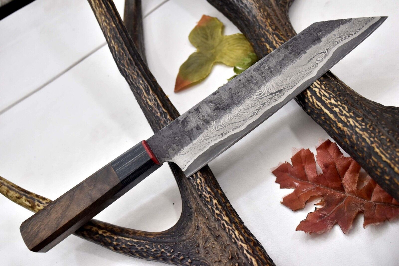 Experience craftsmanship at its finest with this Custom Handmade Hammered San Mai Damascus Steel Chef Knife, featuring a premium walnut wood handle. This high-performance kitchen knife is hand-forged from a layered fusion of 1095 high carbon steel and 15N20 nickel, forming a beautiful 512-layer ladder pattern Damascus design. With an overall length of 13.8 inches, the 8.5-inch blade is 3.97 mm thick and 1.8 inches wide, offering both power and precision. The 5.3-inch handle is ergonomically shaped from durable walnut, ensuring a secure and comfortable grip for extended use. The blade is cryogenically heat-treated in liquid nitrogen to improve toughness and is hardened to a Rockwell rating of 56–58 HRC. Whether you’re a chef, hunter, outdoorsman, or collector, this knife offers top-tier performance and one-of-a-kind aesthetics. Fast priority shipping is available, and international customers are welcome.