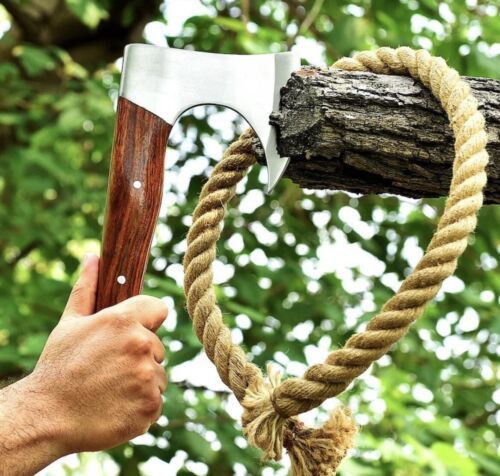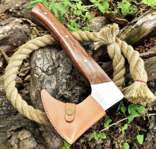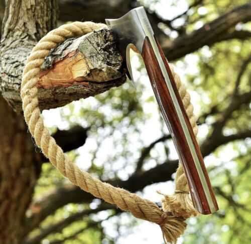 This Custom Handmade High Carbon Steel Tomahawk is a striking blend of function and artistry, crafted to honor the legacy of Viking axes while serving as a durable tool. With an overall length of 12 inches and an axe head measuring 5 x 4 inches, this compact yet powerful piece is ideal for camping, hunting, or display. The axe head is hand-forged from high carbon steel and finished with engraving, etching, and carving to highlight intricate detail. The handle, made from cocobolo wood, is treated with oil for durability and a natural polished finish.Each axe comes with a premium genuine leather sheath, protecting the blade while adding to its traditional aesthetic. The forged cutting edge ensures strength, sharpness, and reliability, making this axe fully functional and not just decorative. Every piece is 100% handmade, meaning no two axes are exactly alike—each carries unique grain patterns, carvings, and finishes that make it a one-of-a-kind collectible.we also offer custom orders, where you can personalize your axe with symbols, runes, or images etched into the blade. Whether you are a collector, an outdoor adventurer, or someone seeking a meaningful gift, this replica Viking axe combines history, craftsmanship, and practical use in one masterpiece.