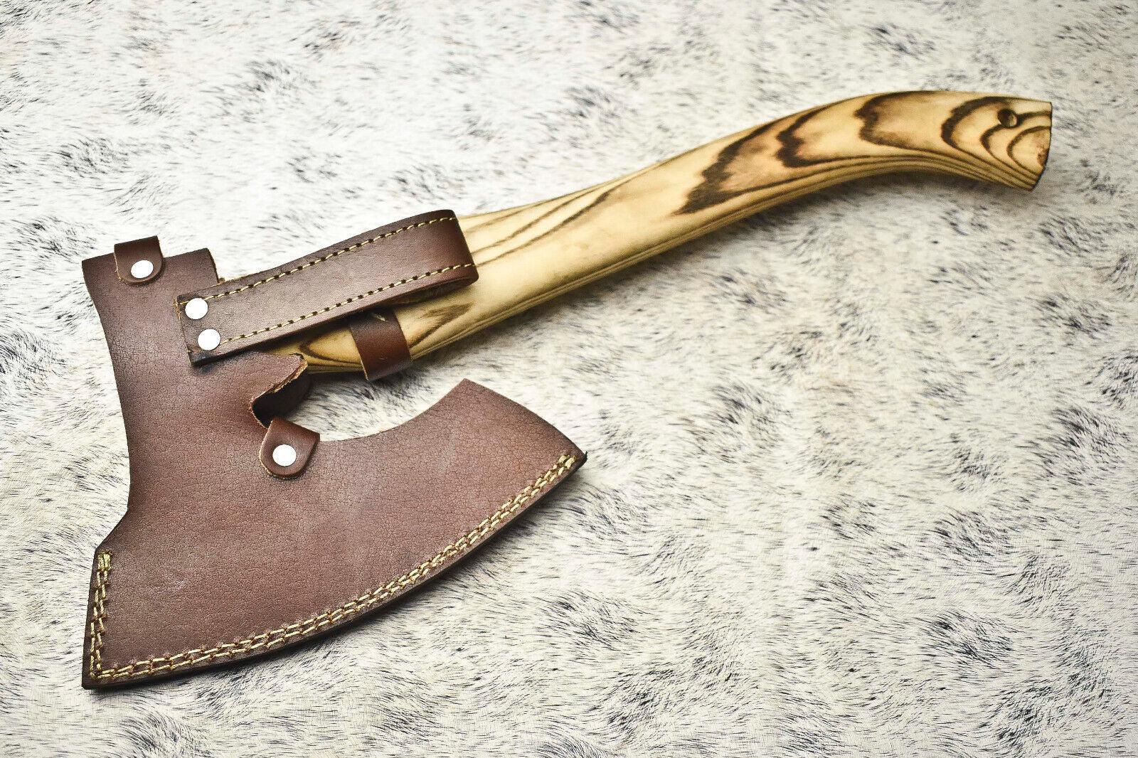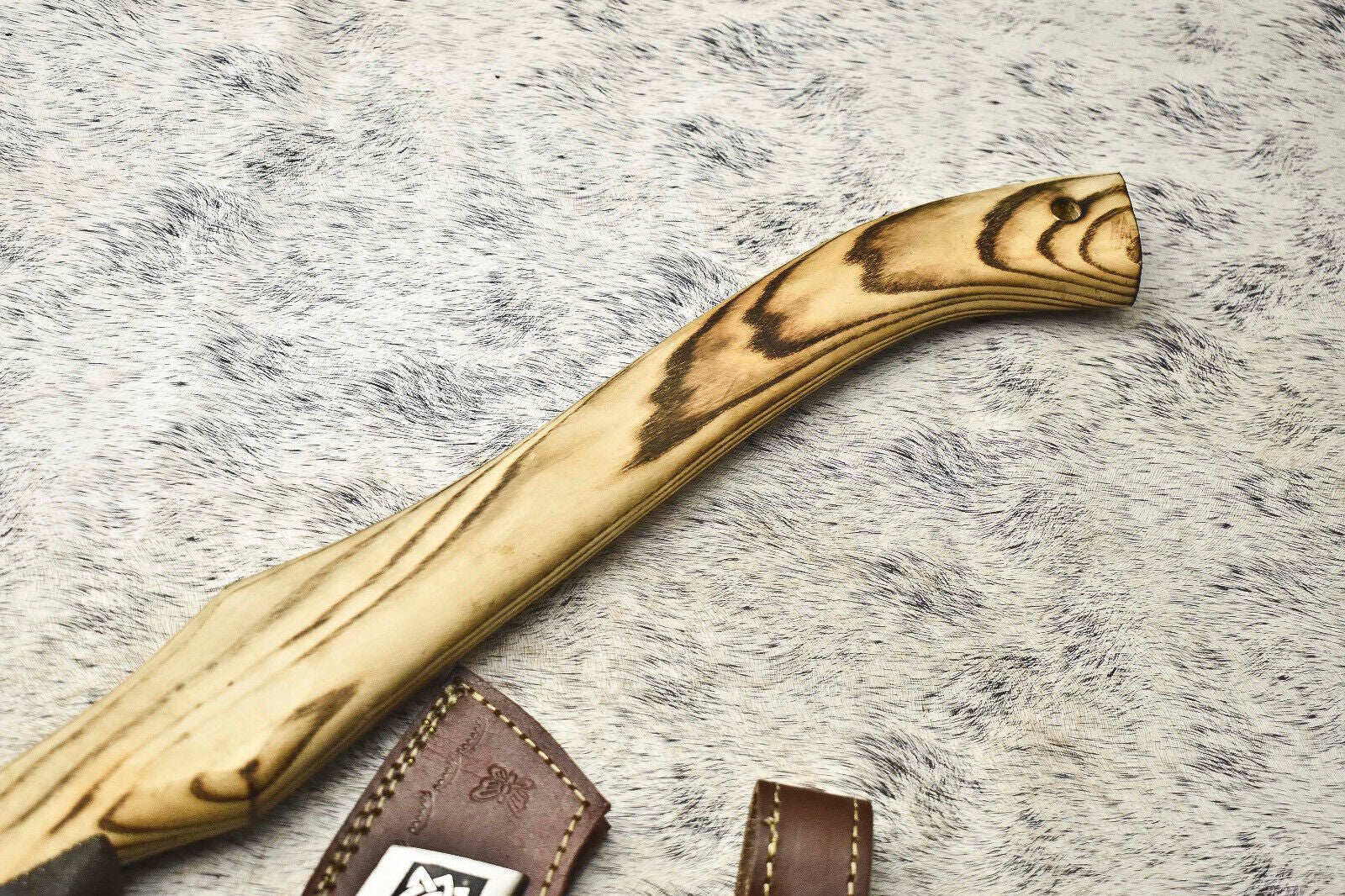 This custom handmade Viking axe is forged from genuine high carbon steel, combining 1095HC and 15N20 nickel carbon for strength, durability, and sharpness. The blade features a stunning laser-etched design with a 6-inch cutting edge and a 5-inch length, oil-tempered to a Rockwell hardness of 58–60 HRC for long-lasting performance. Sharpened at a precise 20-degree edge, this axe is designed for real use in hunting, camping, bushcraft, and outdoor survival. The handle measures 18 inches and is hand-polished for comfort, balance, and a secure grip during heavy-duty tasks. Unlike mass-produced tools, this Viking axe is 100% handmade with no CNC machining, making each piece unique with its own handcrafted characteristics. The forging process creates a striking contrast in the steel—nickel turns satin while high carbon darkens to a bold gray, resulting in a beautiful and functional blade. Every axe is individually sharpened and finished, ensuring superior performance and authentic craftsmanship. Whether used as a working hatchet, a tactical tomahawk, or a collectible gift, this Viking axe delivers unmatched quality and reliability at an exceptional value.