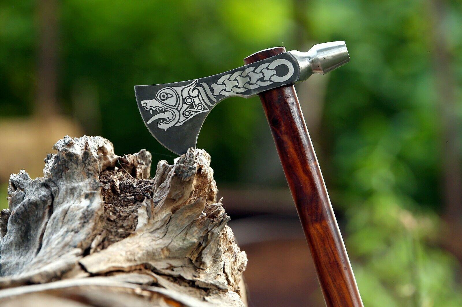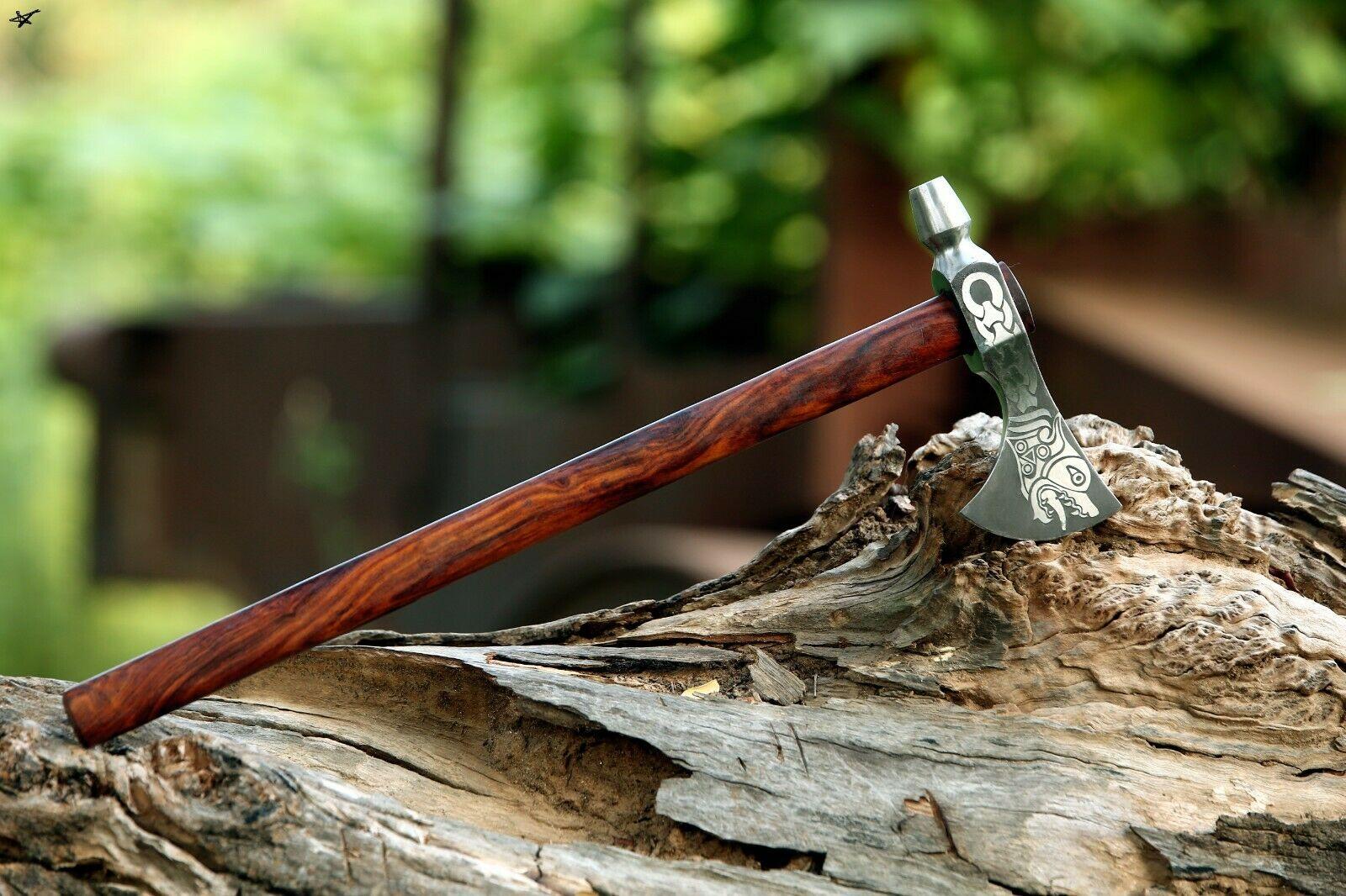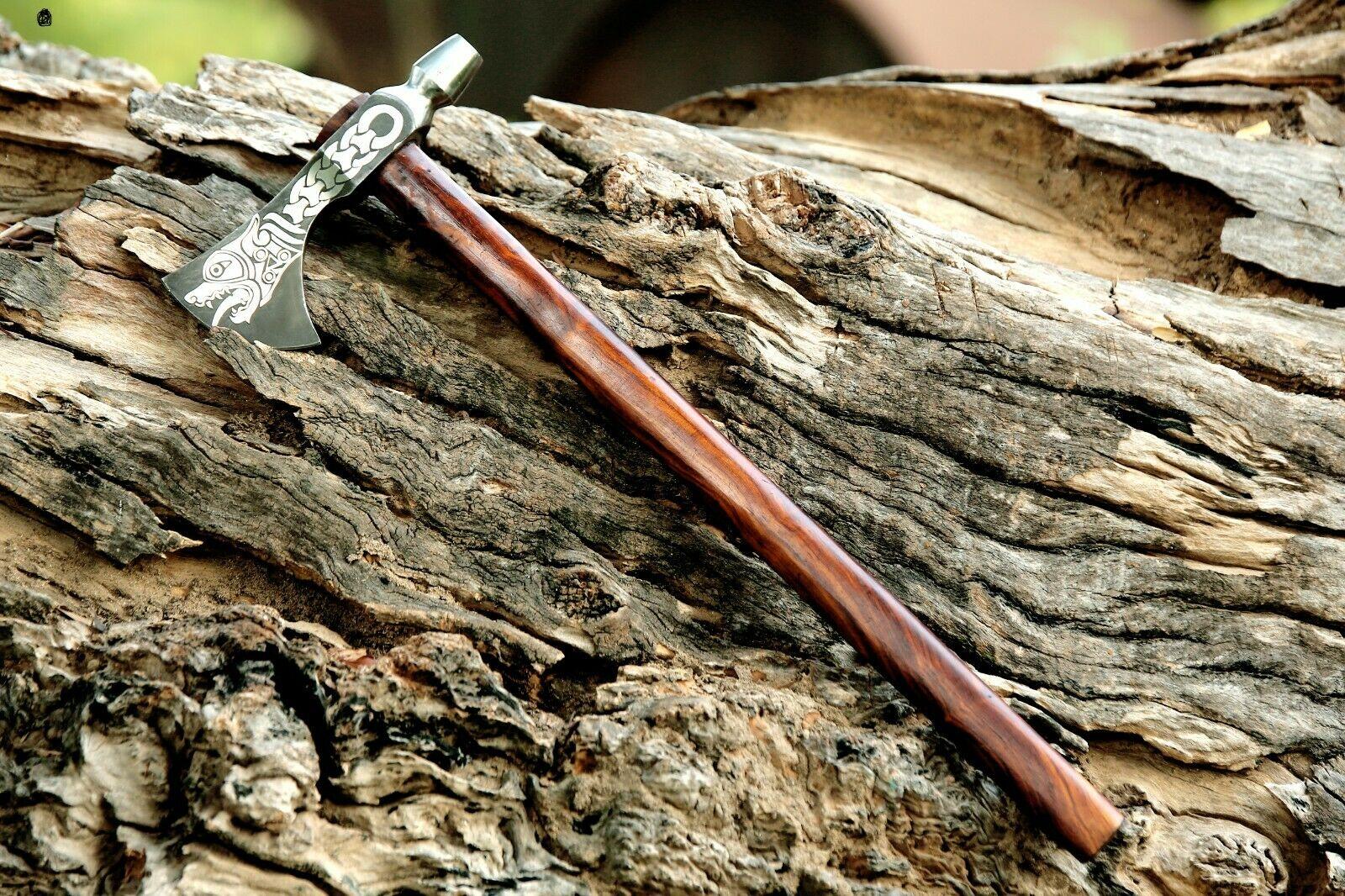 Unleash the spirit of the Norse with this Custom Handmade High Carbon Steel Vikings Axe, a masterfully forged tomahawk and hatchet designed for collectors, outdoor enthusiasts, and historical reenactments. This axe measures 22 inches in total length with a 9-inch blade height and a 3.5-inch cutting edge, crafted from high carbon steel for exceptional strength and durability. The walnut wood handle is hand-shaped for a secure and comfortable grip, while the leather sheath provides safe storage and transport.The axe head is profiled, ground, heat-treated, and acid-etched, revealing a striking pattern that highlights the quality craftsmanship and attention to detail. Every piece is 100% handmade, ensuring unique characteristics that make each axe one-of-a-kind. The blade is fully tempered and sharpened, ready for cutting, chopping, or throwing, and the beautifully etched handle adds a decorative and historical touch.