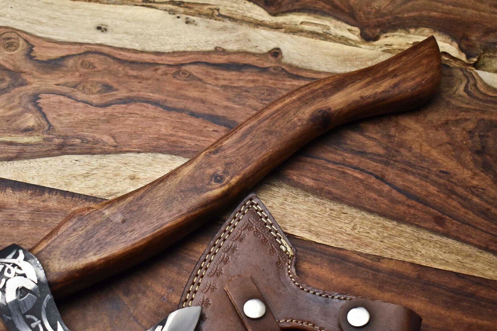 Step into the world of Viking craftsmanship with this custom handmade high carbon steel Viking axe. Each blade is meticulously forged from a premium mixture of 1095HC and 15N20 nickel carbon, ensuring durability and a long-lasting sharp edge. The axe features a striking laser-etched design, giving the blade a satin and blackish-gray finish that highlights its handcrafted details. With a total length of 18 inches, a 5-inch handle, and a 6-inch cutting edge, this hatchet is perfectly balanced for both display and practical use. The handle is hand-polished for a comfortable grip, and the blade is sharpened to a precise 20-degree edge for optimal performance. Every axe is entirely handmade without CNC machining, making each piece unique with subtle variations that reflect its artisan construction. Ideal for collectors, reenactments, or outdoor enthusiasts, this Viking axe combines historical design with modern craftsmanship. A perfect gift for those who appreciate Norse heritage, medieval weaponry, or functional hand-forged tools. Whether used for camping, chopping wood, or as a display piece, this axe brings both functionality and authentic Viking aesthetics to your collection.