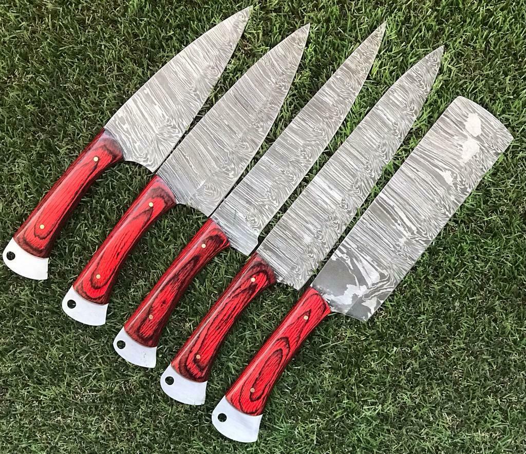 This custom handmade twist Damascus steel chef knife set is crafted to combine traditional artistry with modern performance. Each knife in the set ranges from 9 to 13 inches in overall length, making it perfect for a variety of kitchen tasks from slicing and chopping to precision cutting. The blade is forged from high-quality twist-pattern Damascus steel, offering not only a striking visual appeal but also exceptional strength, durability, and sharpness. With a Rockwell hardness of 57–60 HRC, the blades are engineered to hold their edge for long periods, ensuring reliable performance in daily use. The handles are made from premium rosewood, polished to provide a comfortable grip and natural balance during cutting. Every knife is handmade, which means the Damascus patterns will be unique to each blade, ensuring no two knives are exactly alike. Built to professional quality standards, these knives deliver toughness, lateral strength, and outstanding edge retention. Whether you’re a professional chef or a cooking enthusiast, this Damascus steel chef set offers a perfect blend of functionality, durability, and craftsmanship. Please note, the sheath is not included. Each set is handmade, ensuring you receive a durable, unique, and high-performing chef knife collection.