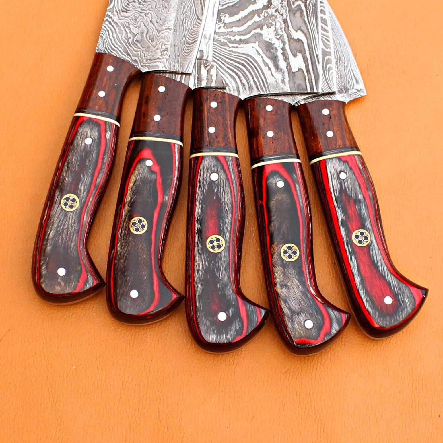 This custom handmade twist Damascus steel chef knife set is a blend of art, precision, and durability, perfect for chefs, hunters, and knife collectors. Each knife in this set features an overall length of 9 to 13 inches, a twist Damascus pattern, and a blade hardness of 57-60 HRC for excellent edge retention. The handles are crafted from premium walnut or pakka wood, providing a comfortable and secure grip, and each knife comes with a leather sheath for safe storage. All knives are 100% handmade, ensuring each piece is unique. Due to the natural characteristics of Damascus steel, the pattern on your knife may differ from the pictures, making every knife truly one-of-a-kind. Our knives are tested for toughness, strength, and edge retention, averaging near 58 on the Rockwell scale to ensure the perfect balance of durability and performance. Ideal for professional use, outdoor activities, or as a collectible, these knives combine elegance and functionality in one set.