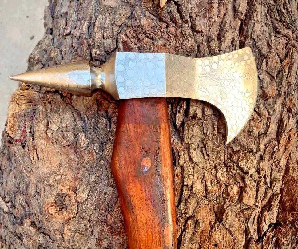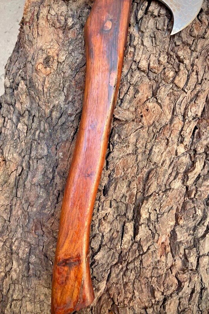 This custom handmade Viking axe is a perfect combination of craftsmanship and functionality, designed for both collectors and outdoor enthusiasts. Hand-forged from high-quality carbon steel, the blade is sharp, durable, and ready for all cutting tasks. The axe features a full tang and a sturdy wooden handle, providing a secure and comfortable grip for both left- and right-handed users. With an overall length of 18 inches, it is perfectly balanced for bushcraft, camping, or forest use, making it a reliable companion for chopping wood, clearing trails, or general outdoor activities. The elegant silver finish and unique Viking-inspired design make this axe not only practical but also a striking piece for any collection. Each axe comes with a high-quality leather sheath to protect the blade and ensure safe transport. Handcrafted with attention to detail, this Viking axe combines traditional design with modern utility, making it a lasting tool and an excellent gift for enthusiasts of knives, axes, and medieval-inspired gear.
