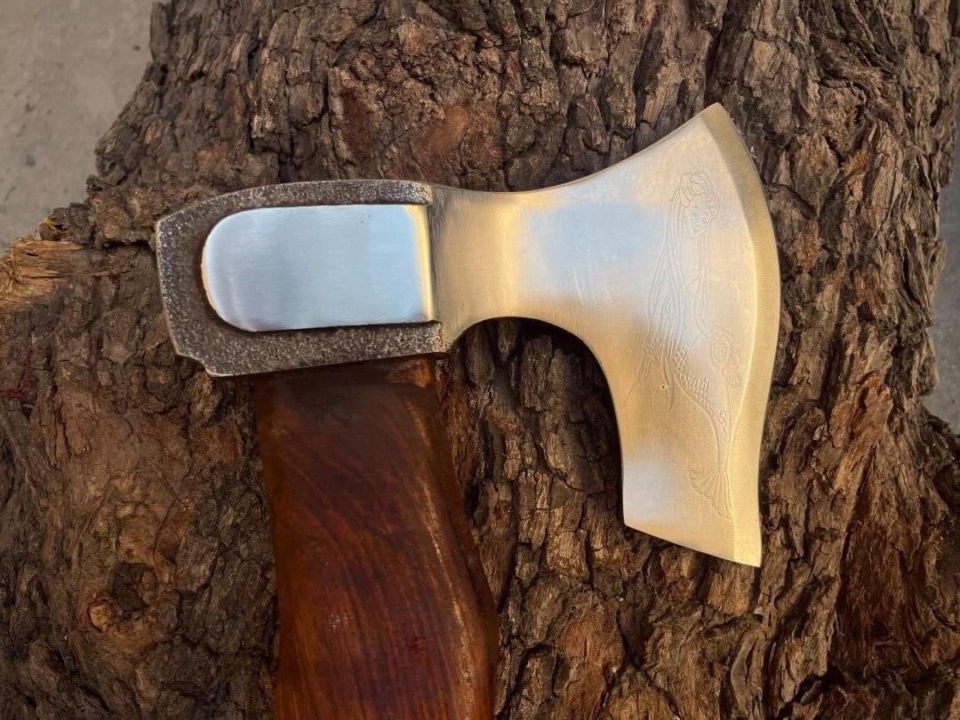 This custom handmade Viking axe is a rugged and reliable tool designed for bushcraft, forest work, camping, and outdoor adventures. Hand-forged from high-quality carbon steel, the blade delivers excellent cutting power and durability, making it ideal for chopping wood, clearing brush, and handling demanding survival tasks. Measuring an impressive 20 inches in overall length, this axe provides the perfect balance of strength and control, offering both practical use and historical charm.