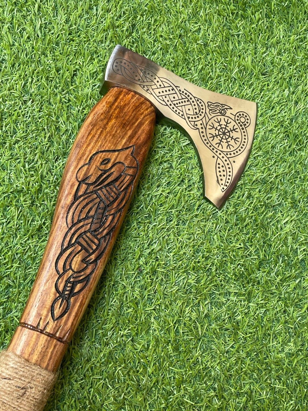 The hand-forged carbon steel blade delivers durability and sharpness, while the sturdy wooden handle provides a comfortable grip and a traditional Viking-inspired look. Finished with a unique multi-color design, this axe combines functionality with artistry, making it an eye-catching piece for collectors. Its ambidextrous design allows both right and left-handed users to wield it with ease.