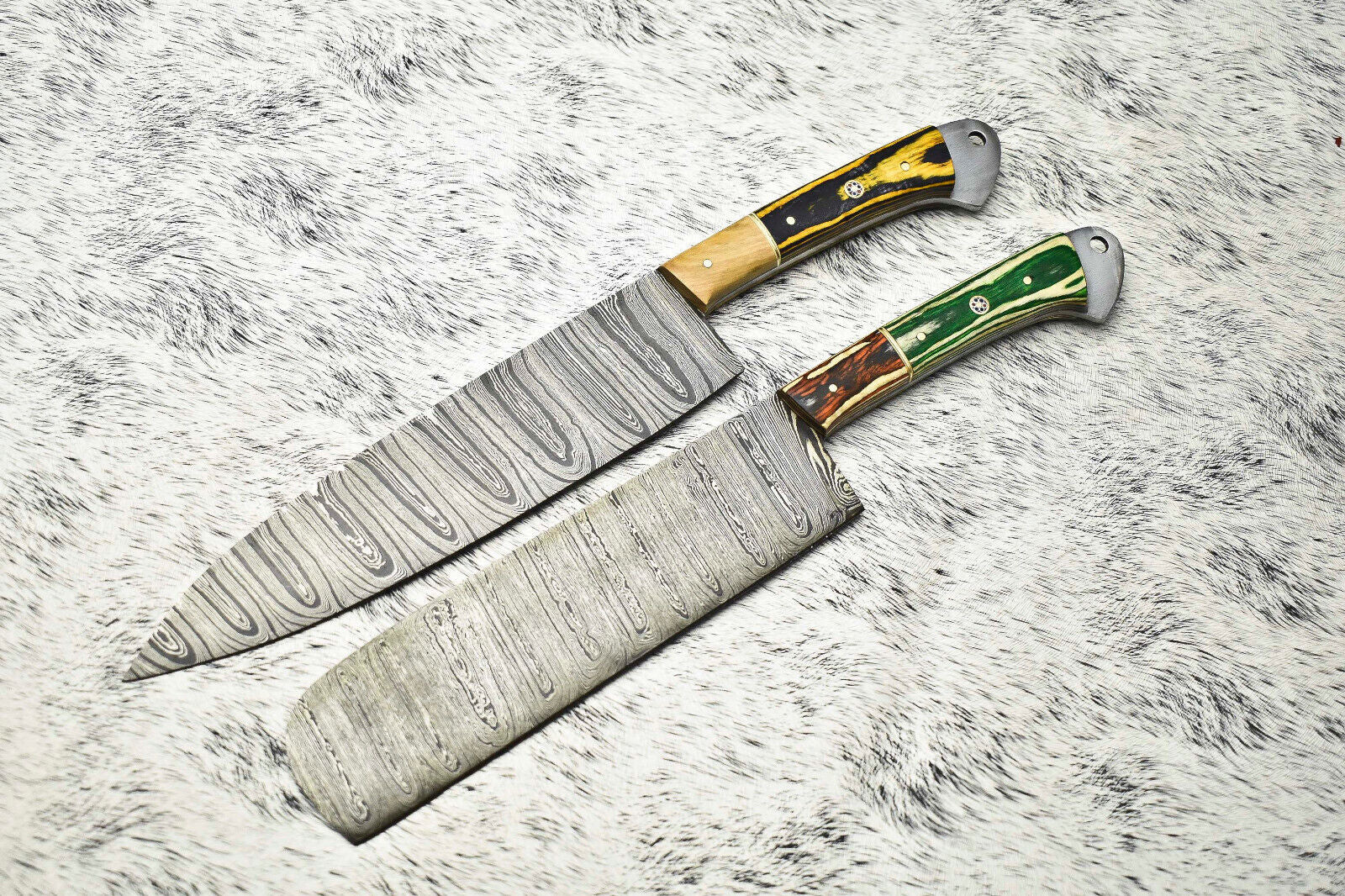 Custom Lot of 2 Handmade Hammered Damascus Steel Chef Knives