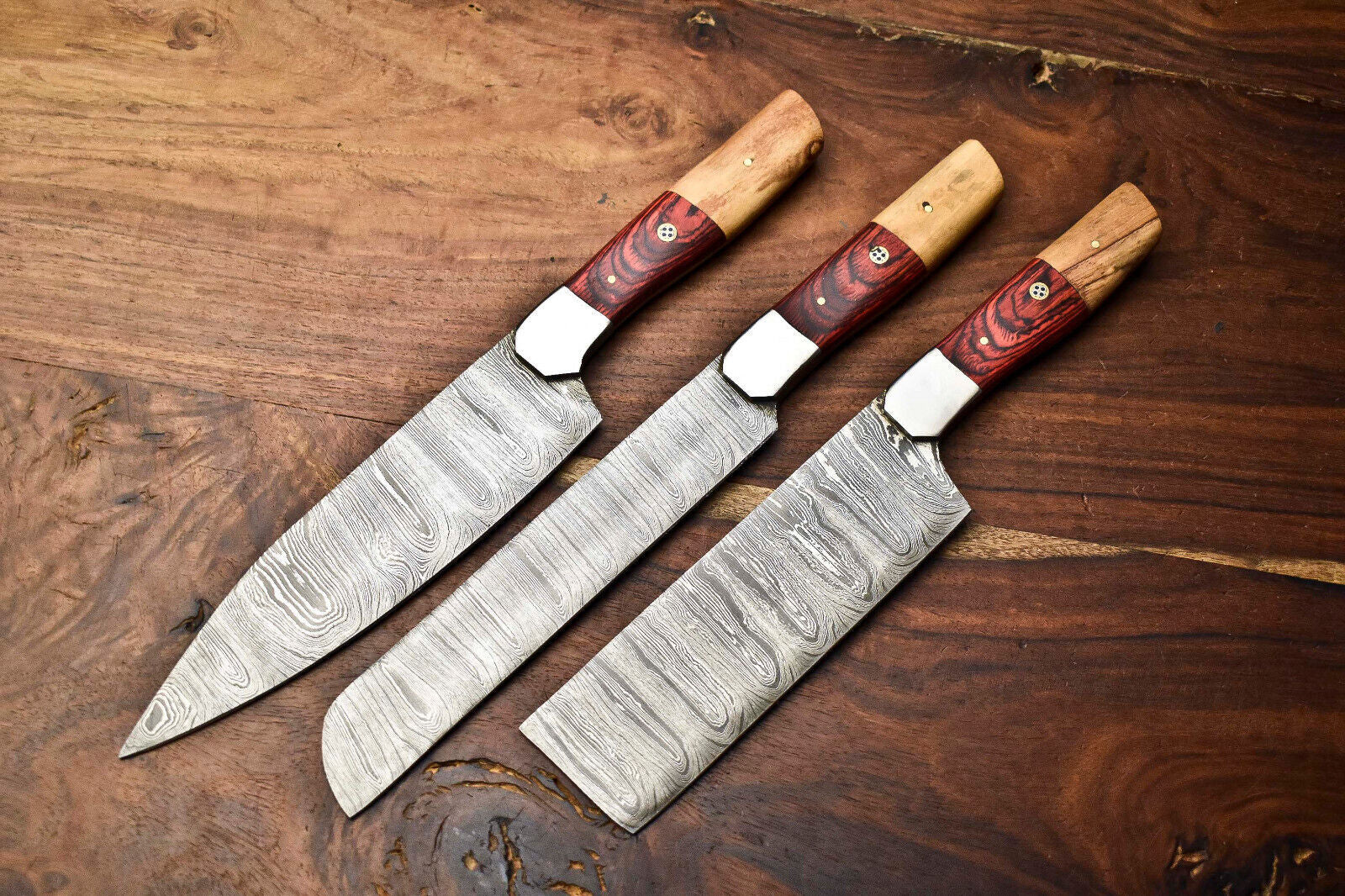 Custom Lot Of 3 Handmade Damascus Steel Blade Chef Set Knife