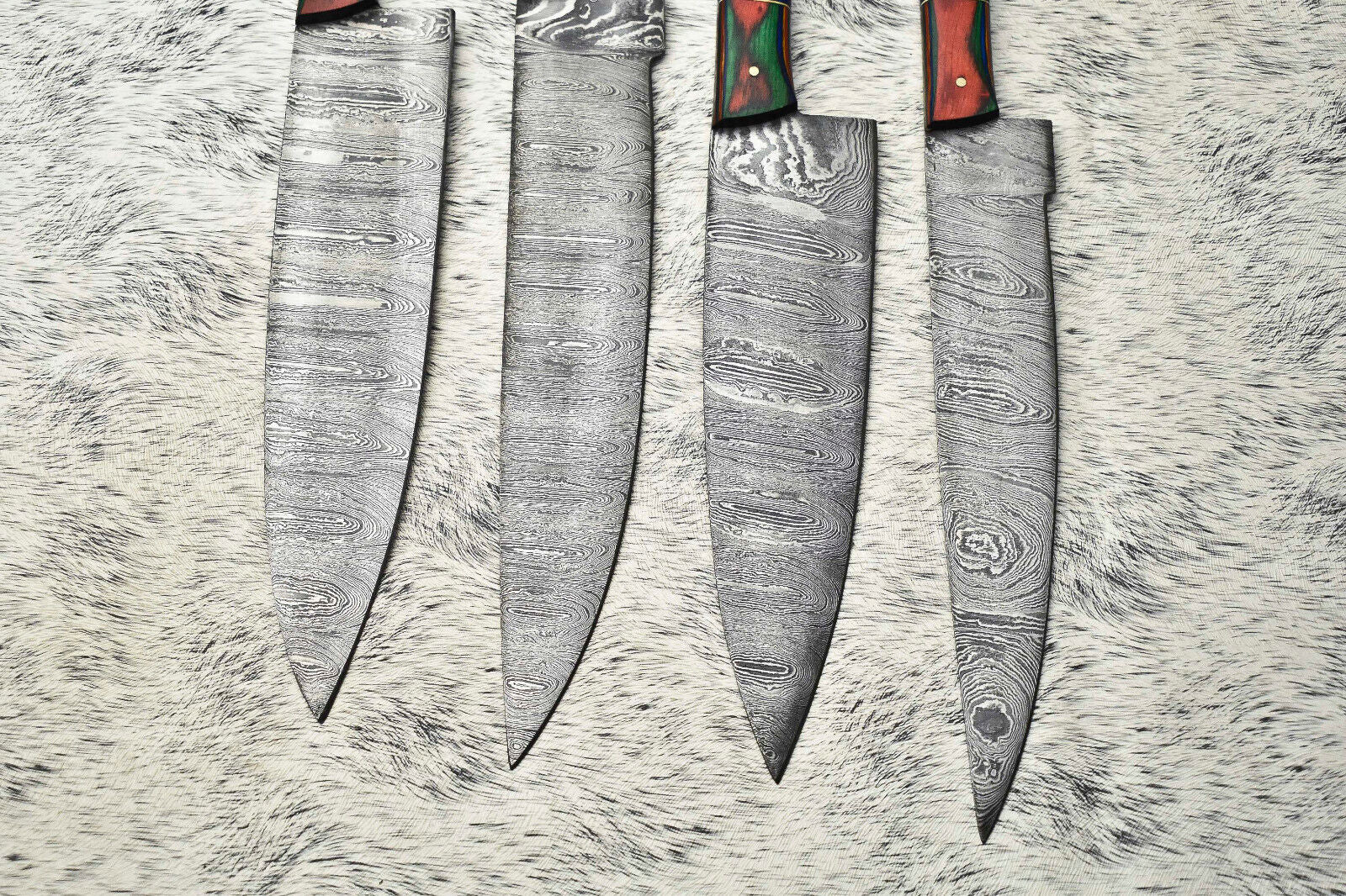 This custom lot of 4 handmade hammered Damascus steel blade chef set knives represents the pinnacle of craftsmanship and durability. Each knife is made from a combination of 1095HC and 15N20 nickel carbon steel, heated and folded multiple times to achieve 384 true layers. The blades are then acid burned, producing a striking nickel satin color with the high carbon steel showing blackish-gray tones, exposing the intricate Damascus pattern. Afterward, each blade and handle are hand polished, creating a sharp edge and a smooth satin finish. Every knife is 100% handmade, ensuring that each piece is unique and perfect for professional chefs, collectors, or anyone who appreciates high-quality, durable kitchen cutlery.