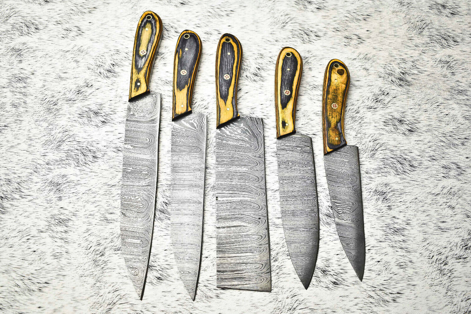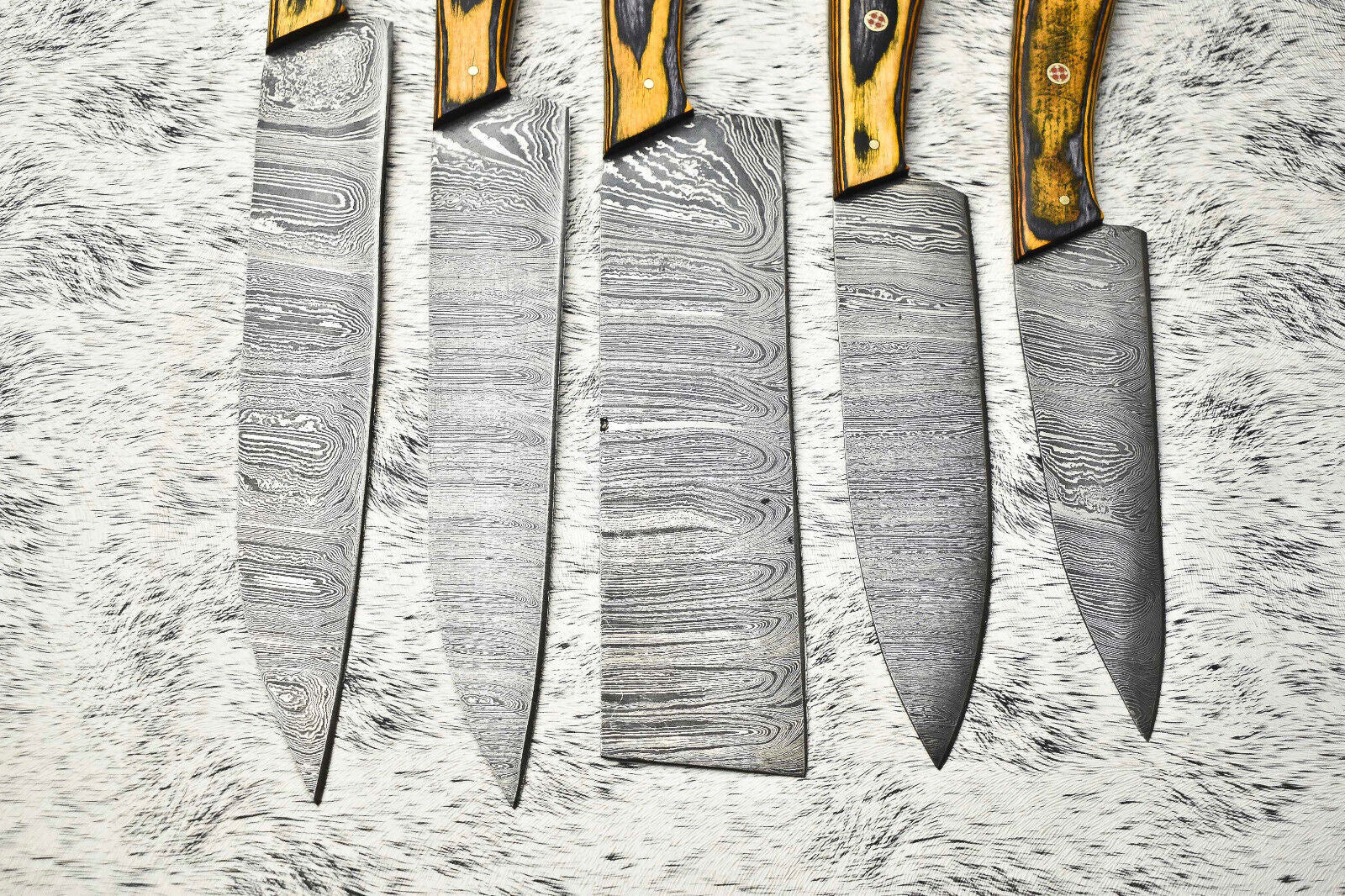 Stunning custom lot of 5 handmade hammered Damascus steel blade chef knives. Each blade is crafted from real Damascus steel, not just acid-etched. Our Damascus steel is made by expertly layering and folding a mixture of 1095HC and 15N20 nickel carbon steels 384 times. After forging, the blade is burned in acid to reveal the distinct nickel satin color with high carbon steel showing a blackish gray, exposing the unique layered pattern known as "Damascus." While all Damascus blades are acid-etched to reveal layers, our high polish on the metal results in a shiny satin finish like premium steels. The acid burn highlights the blade’s striking layered design while the edge is sharpened to perfection.The handles are meticulously high polished, buffing off the acid layer to create a smooth, elegant finish. All knives come 100% handmade with no CNC machining, ensuring each piece is unique with subtle handmade characteristics.
