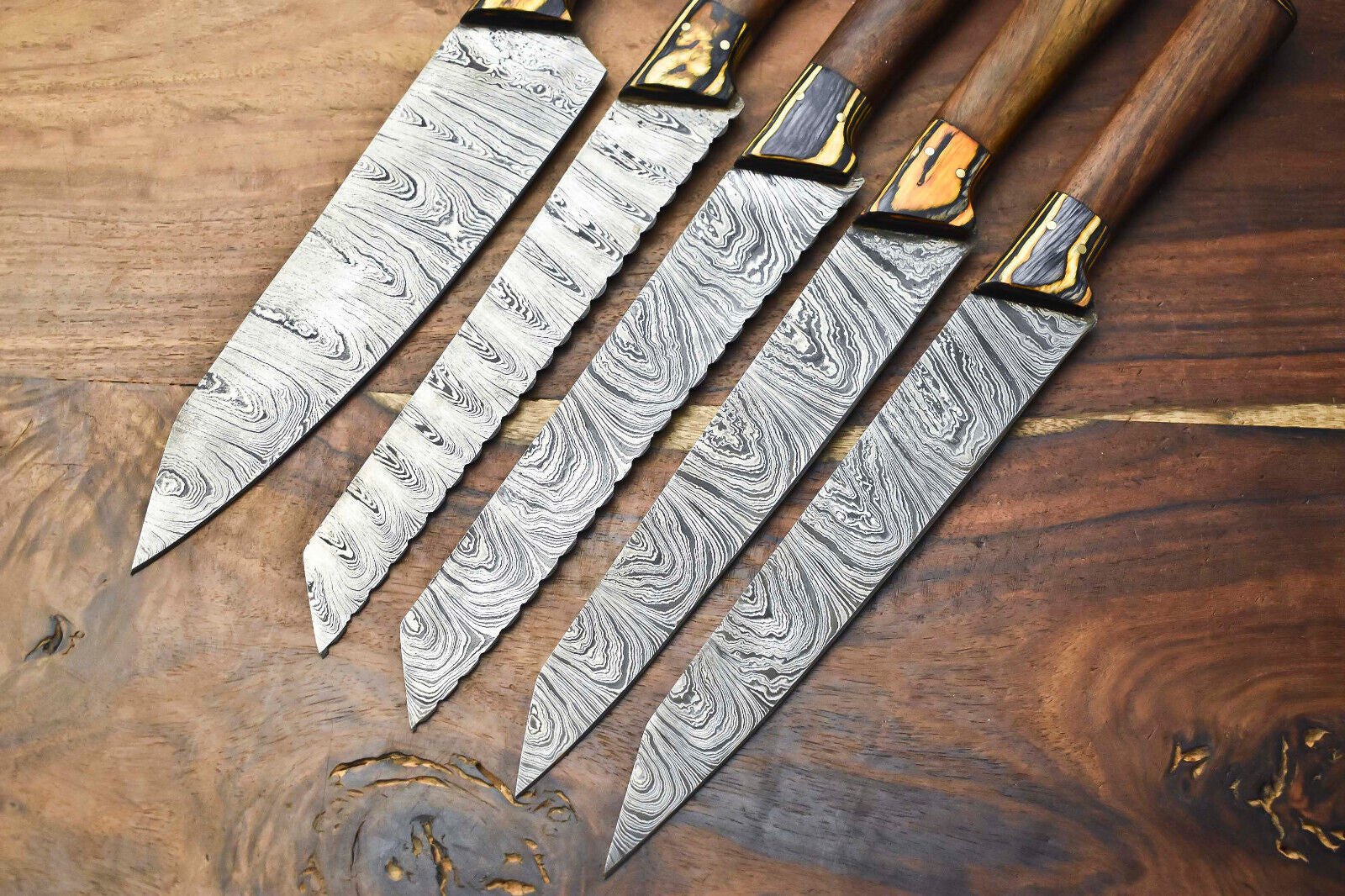 Experience the craftsmanship and performance of our Custom Lot of 5 Handmade Hammered Damascus Steel Blade Chef Knife Set. Each knife is forged from genuine Damascus steel, crafted by combining 1095 high carbon steel and 15N20 nickel steel, folded repeatedly to create 384 stunning layers. This unique forging process, followed by acid etching, reveals the intricate and striking Damascus patterns that make every blade a one-of-a-kind masterpiece. The blades are tempered for strength, sharpened to a razor edge, and polished to perfection for both beauty and durability. Designed for chefs, culinary enthusiasts, and collectors, this set offers superior cutting precision and long-lasting performance. Every knife is 100% handmade, ensuring individuality, exceptional quality, and timeless appeal.
