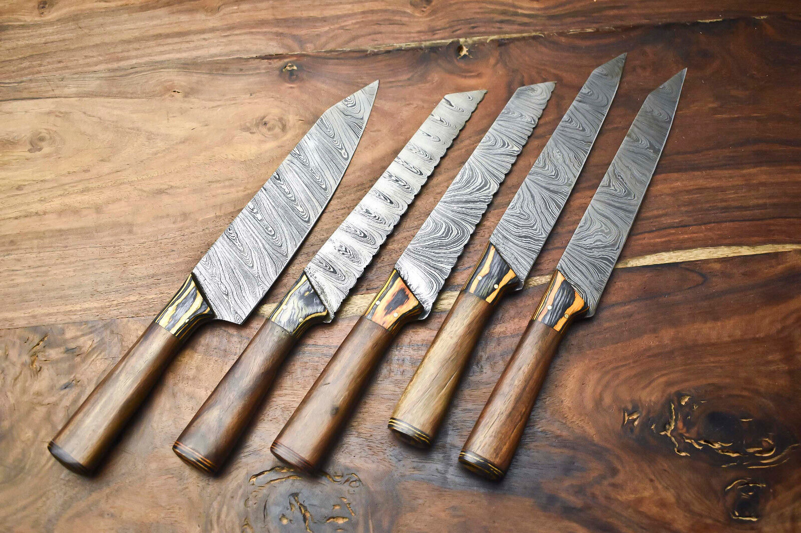 Custom Lot of 5 Handmade Hammered Damascus Steel Blade Chef Knife Set with Sheath