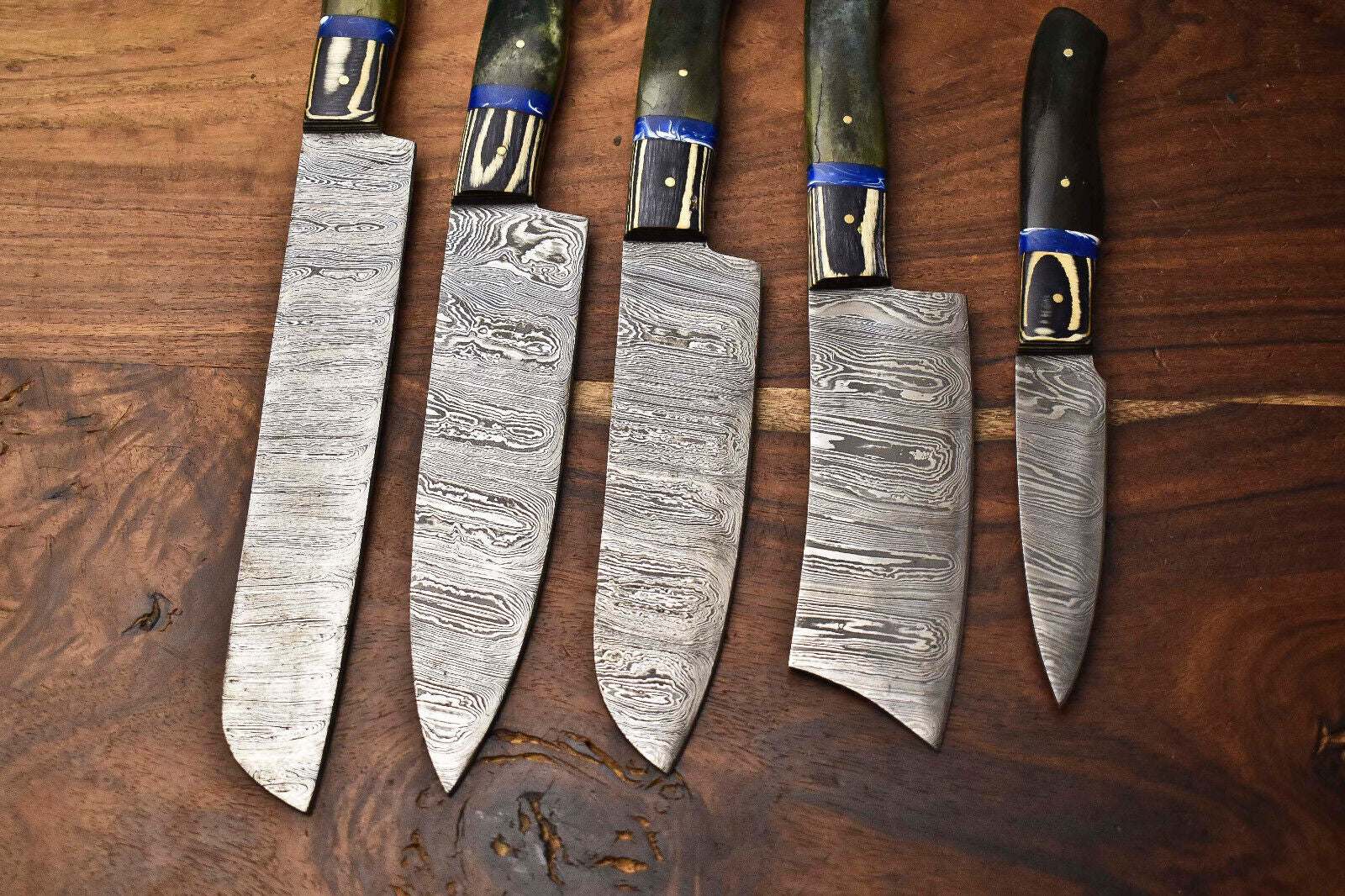 Custom Lot of 5 Handmade Hammered Damascus Steel Blade Chef Set Knives – Premium Forged Kitchen Knife Collection