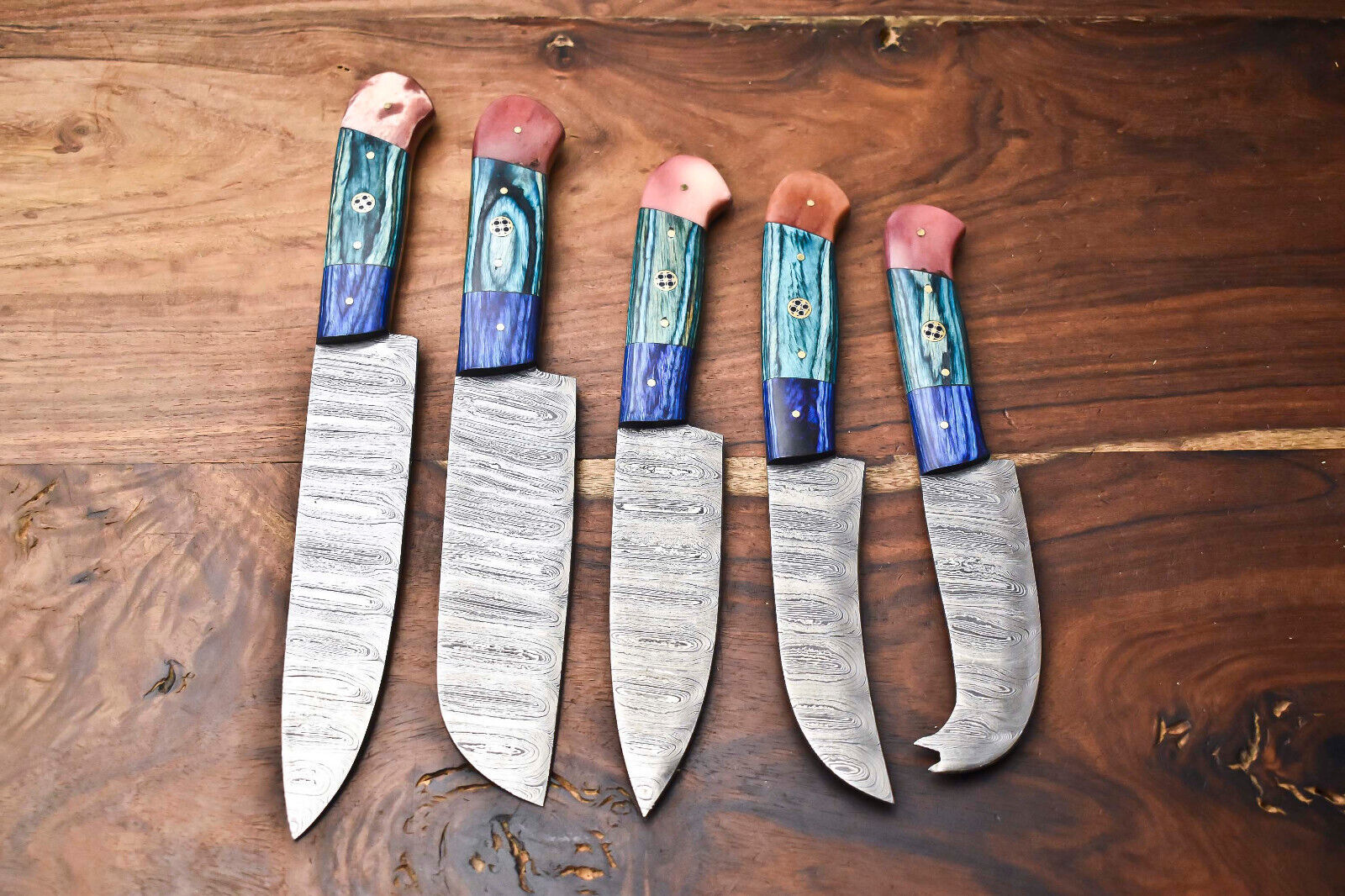 Custom Lot of 5 Handmade Hammered Damascus Steel Chef Knives – 384 Layer Professional Kitchen Set