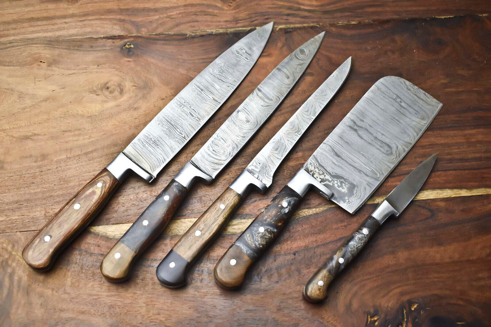 Custom Lot of 5 Handmade Hammered Damascus Steel Chef Knives – Professional Kitchen Knife Set