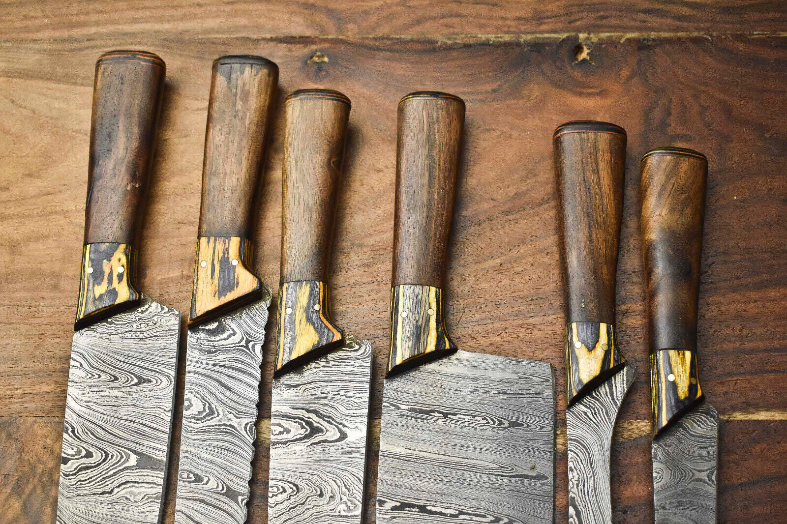 This Custom Lot of 6 Handmade Hammered Damascus Steel Blade Chef Set Knives offers exceptional craftsmanship and quality. Each knife features real Damascus steel, made from a mixture of 1095HC and 15N20 nickel carbon steels. The bars are heated, folded repeatedly to create 384 layers, and then acid-etched to reveal the unique, beautiful patterns characteristic of Damascus steel. The acid burn highlights the layers with nickel turning a satin color and the high carbon steel becoming blackish gray. After crafting, the handles are high polished and the blade edges are sharpened to perfection, with the acid burned edges turning satin. These knives combine both stunning aesthetics and durable functionality. All our knives are 100% handmade, showcasing true artisanal skill and attention to detail.
