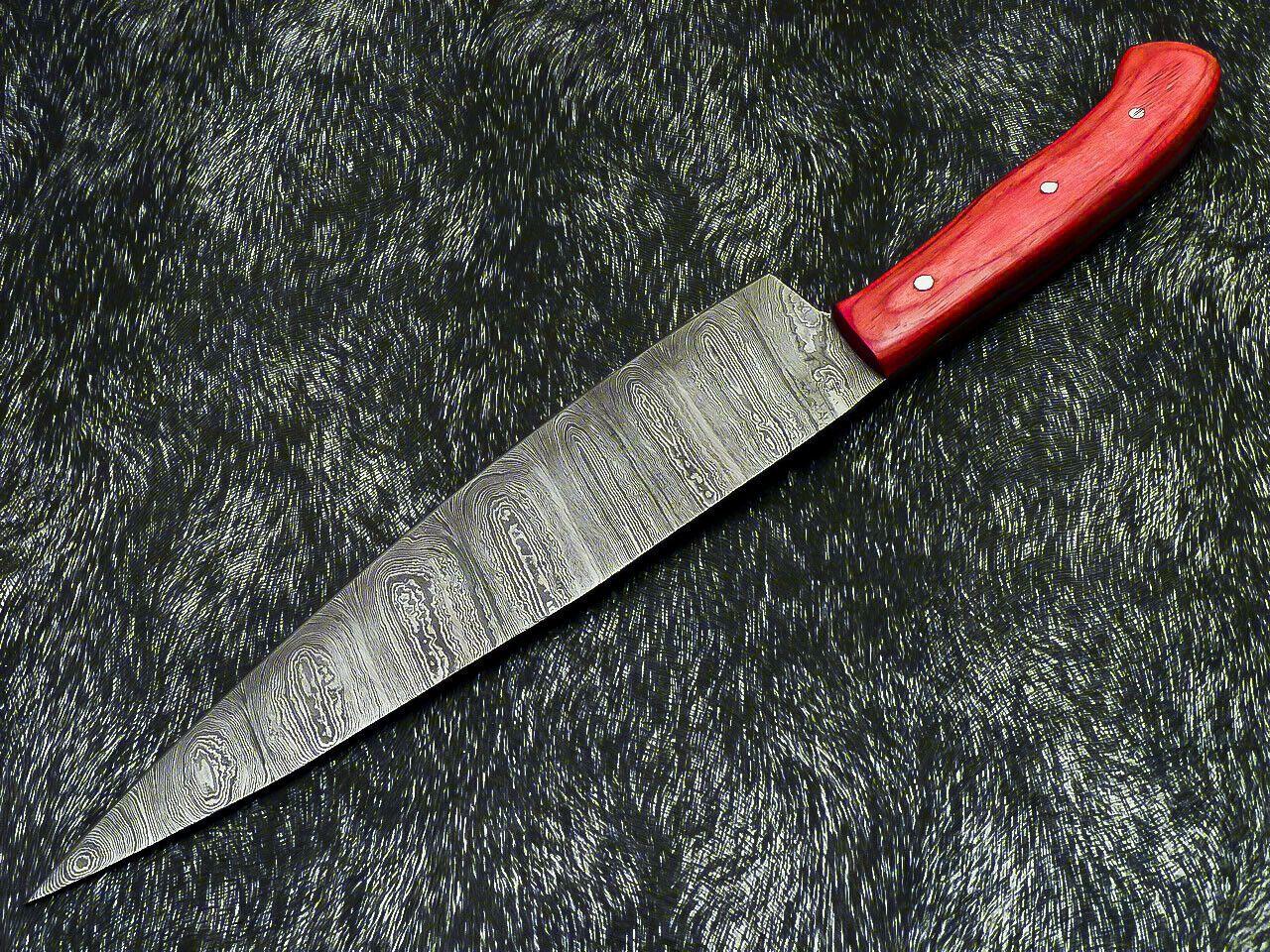 This custom made hand forged Damascus steel chef kitchen knife is a perfect blend of durability, elegance, and functionality. The blade is crafted with 512 layers of 4340 stainless steel and 1075 high carbon steel, ensuring excellent strength and long-lasting sharpness with a hardness of 55–58 HRC. Designed for heavy-duty use, this robust knife has been lab tested under intense conditions to guarantee quality performance. The handle is made from premium hardwood scales, securely fastened with brass pins, a mosaic pin, and strong epoxy, providing a comfortable grip and lifetime durability. Its handcrafted design makes it not only a reliable kitchen essential but also a stylish collector’s piece. An ideal gift for loved ones, this Damascus steel knife is a thoughtful choice for occasions such as Valentine’s Day, Father’s Day, Mother’s Day, Thanksgiving, Halloween, New Year’s, or any special celebration. Carefully handmade and shipped worldwide through DHL, this knife is built for chefs, home cooks, and outdoor enthusiasts alike.