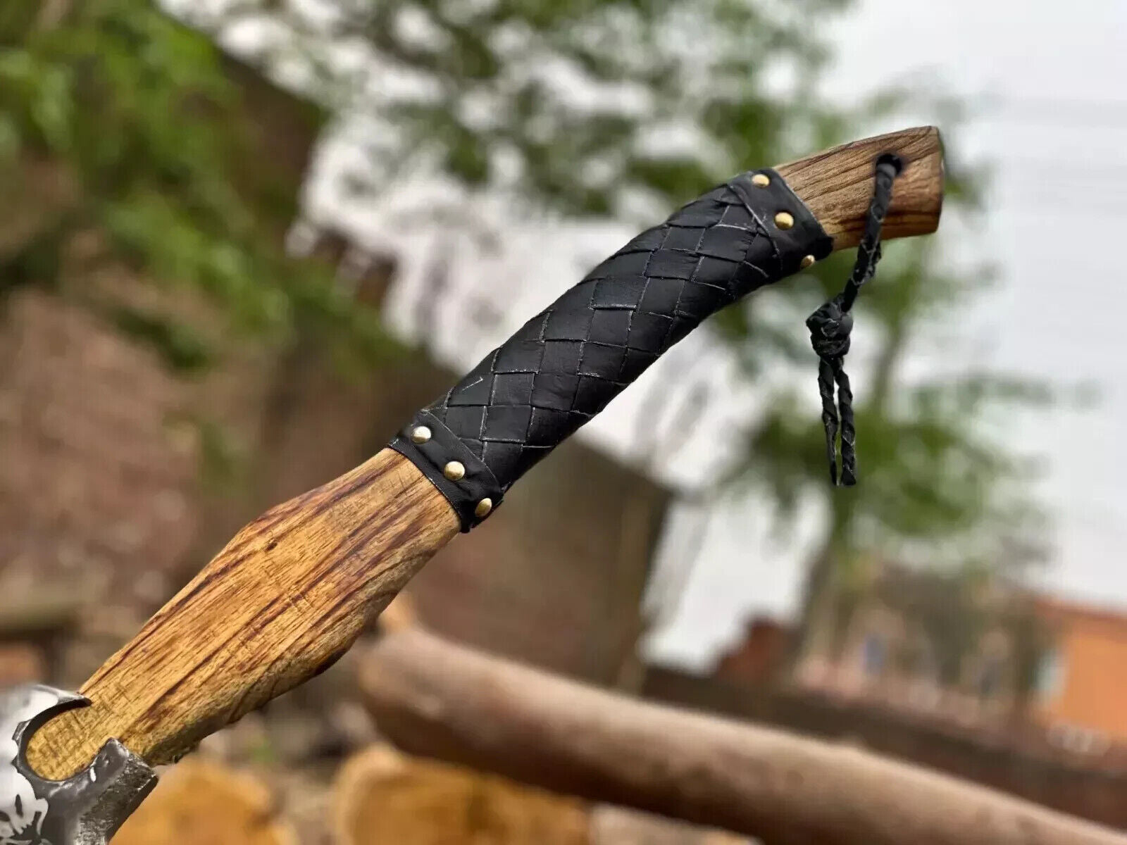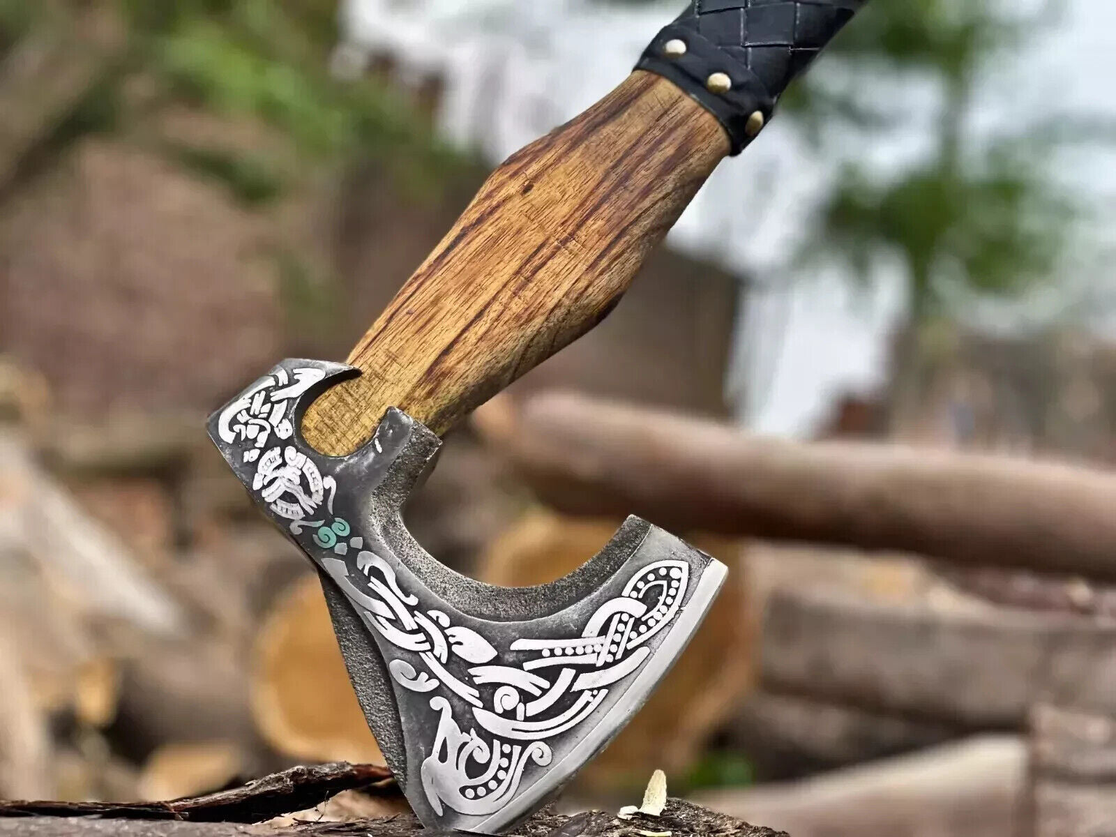 This custom forged viking combat axe is a unique combination of artistry and functionality, designed for outdoor use and collectors alike. Hand-forged from high-quality carbon steel, the blade features an etched face that reflects the spirit of the historic war axe viking while offering durability for real-world tasks. With a full tang construction for strength, this axe measures approximately 20 inches in overall length, including a 5-inch cutting edge and a 6.5-inch head, providing excellent balance for chopping and cutting. The solid wooden handle enhances grip and comfort, making this two handed viking axe suitable for ambidextrous use. Perfect for bushcraft, camping, and wood cutting, this tool embodies the tradition of the viking dane axe while echoing the rugged style of steel axe osrs, steel city axes, and the steel woods axe. A custom-fitted leather cover is included to protect the blade and ensure safe transport, making this piece practical and long-lasting. Whether used outdoors or displayed in a collection, this replica viking axe pays homage to the legendary vikings battle axe heritage and the iconic imagery of the viking crossed axes, celebrating the enduring power of viking war axes.