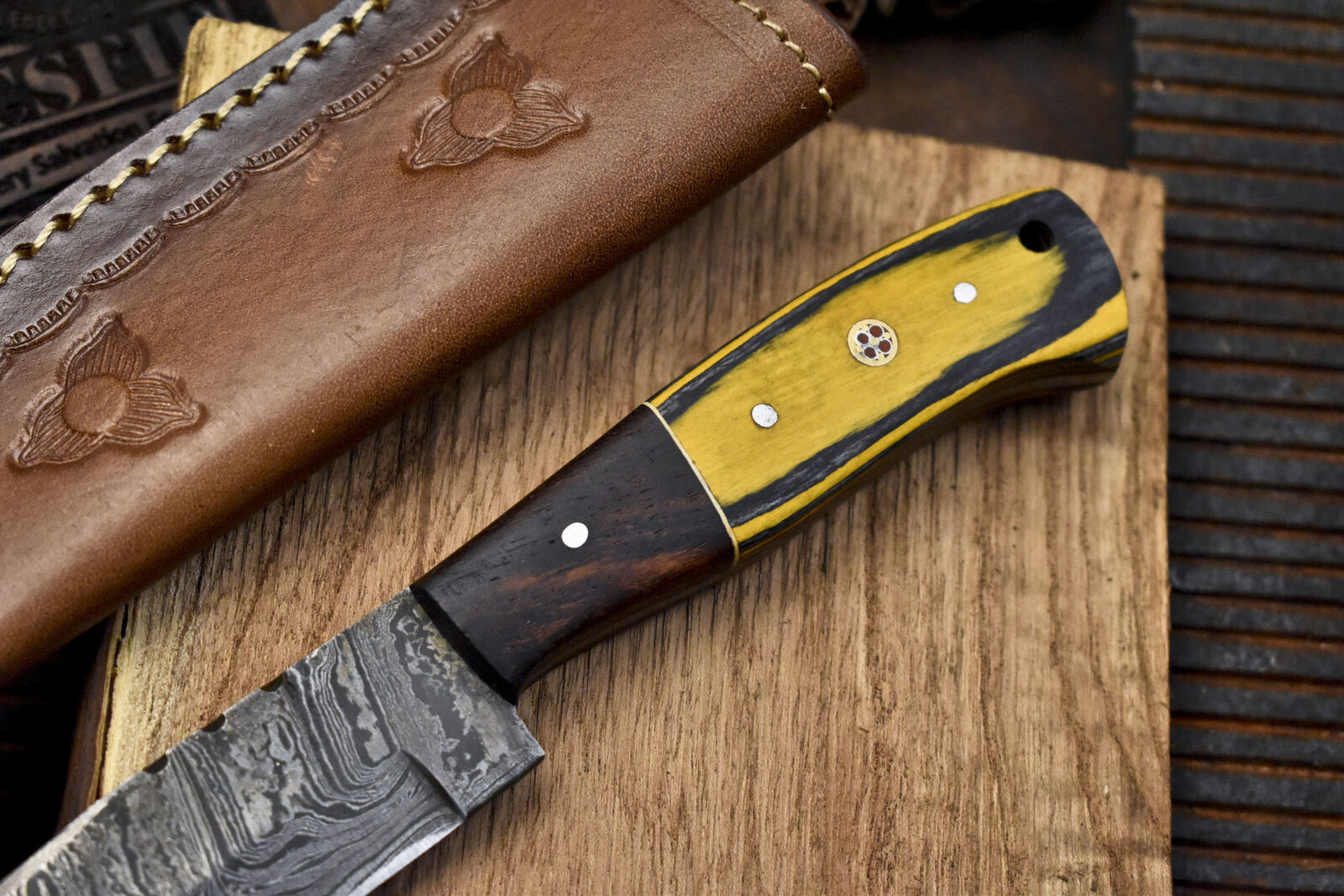 Custom Skinner Knife Twist Damascus Hard Wood Wooden Bolster Decorative w/ Leather Sheath