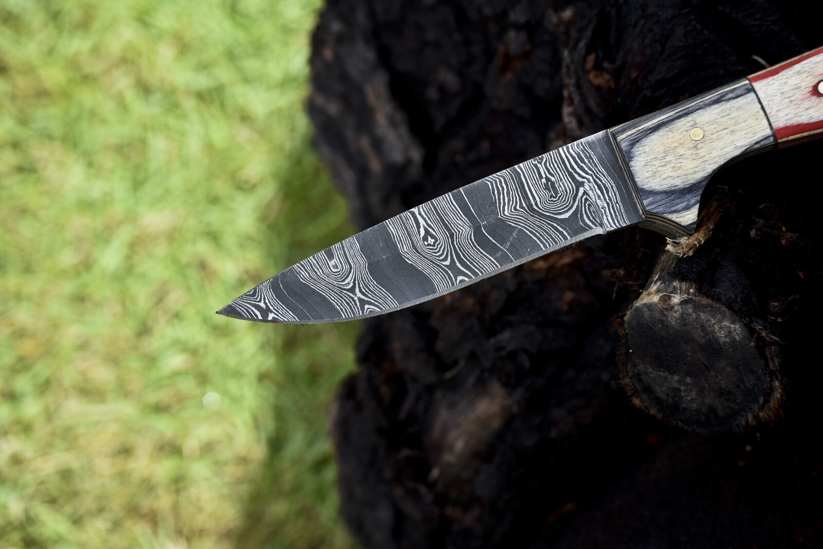 This Custom Skinner Knife features an overall length of approximately 8 inches, including a 4-inch blade made of hand-forged Damascus steel. The blade is crafted from a blend of 1095 and 15N20 steels, repeatedly folded and acid-etched to reveal a stunning twist pattern with striking contrasts from deep blacks to bright silvers. The blade is oil tempered to 58-60 HRC, ensuring a rigid and durable edge perfect for skinning and hunting tasks. The handle is made of durable hard wood paired with a wooden bolster, providing a comfortable and secure grip. This knife comes with a thick, hand-tooled leather sheath sewn with reinforced stitching to withstand years of tough use. To maintain the blade, sharpen it at a 20-degree angle using a diamond wet stone or better, clean with soap and water, dry thoroughly, coat with gun oil, and avoid prolonged storage in the leather sheath to prevent rust. Each knife is 100% handmade with no CNC machining or precut blanks, giving every piece unique handmade characteristics. This knife is an excellent gift for hunters, collectors, or outdoor enthusiasts looking for a functional and beautiful tool.