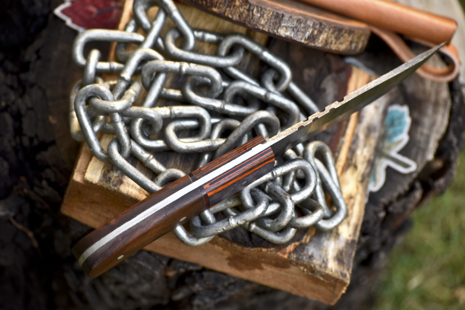This custom Skinner Knife features an overall length of approximately 8.0 inches, with a 4.0-inch twist pattern Damascus steel blade and a 4.0-inch walnut wood handle paired with a wooden bolster. Crafted from a combination of 1095 and 15N20 steels, the blade is repeatedly heated, folded, and acid-etched to reveal the dynamic twist Damascus pattern. The swirling lines create a stunning display of motion and depth, highlighted by contrasts of deep blacks and bright silvers. Tempered to 58-60 HRC, the blade is razor-sharp and rigid, perfect for skinning and precise cutting tasks during hiking and outdoor adventures. The walnut wood handle offers a smooth, ergonomic grip for comfortable handling, while the wooden bolster adds balance and durability. This knife comes with a high-quality, thick leather sheath, hand-tooled and sewn with reinforced stitching to withstand rugged use. Proper care includes sharpening at a 20-degree angle with a diamond wet stone, washing with mild soap and water, thorough drying, and oiling the blade to prevent rust. Avoid storing the knife long-term in the sheath due to leather moisture absorption. Each knife is 100% handmade, making every piece unique with distinct handcrafted features.