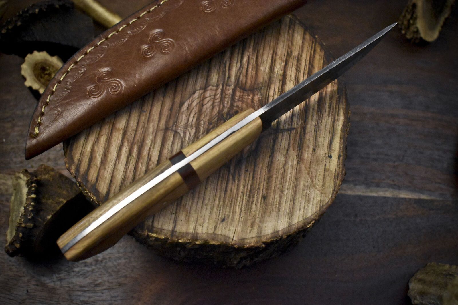 This expertly crafted custom skinner knife is the perfect blend of functionality and artistry. Forged from high-quality twist damascus steel, this blade showcases a mesmerizing pattern created by folding 1095 and 15N20 steel layers, then acid etching the surface for bold contrast. The 3.5-inch blade is oil tempered to 58–60 HRC, delivering superior sharpness and long-lasting performance. Whether used for field dressing or everyday tasks, this compact 8-inch damascus skinner hunting knife performs with precision.