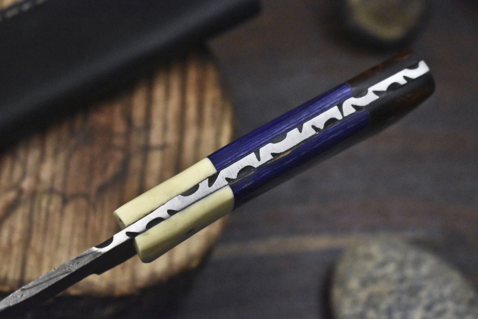This handmade skinner damascus knife includes a thick, hand-tooled leather sheath for safe carry and storage. It's a collector-worthy piece and a reliable working tool for serious outdoorsmen. Whether you're on a hunt or deep in the wilderness, this damascus acid etched fixed skinner knife won’t let you down.