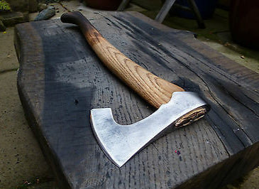 Experience the artistry and power of Norse weaponry with this Custom Viking Styled Battle Axe, a unique hand-forged tool designed for collectors and enthusiasts alike. The vintage steel head has been meticulously cleaned, treated, and custom-shaped, satinized at the poll, and polished to a mirror finish. The cutting edge is wickedly sharp, crafted with precision to combine beauty and function.The ergonomic handle is made from raised-grain Ash with a straight end grain, naturally colored and treated with teak oil and beeswax for durability and grip. Fixed securely with a wooden and steel wedge, the 19-inch handle ensures excellent balance and control. The axe is perfectly aligned, allowing it to be balanced on a single finger with no side roll, making it easy and safe to use. The handle’s design allows for comfortable choking up when precision control is needed.This hand-forged Viking axe comes with a custom leather sheath made from thick full-grain tooling hide, treated for waterproofing and reinforced with black rivets and a gunmetal popper. The sheath can be looped onto a belt for easy carrying. Measuring 5 3/4" from poll to bit with a 4" cutting edge and weighing 1 lb. 5 oz., it’s a practical working tool and a striking display piece. Perfect for cosplay, bushcraft, or as a collectible Viking weapon.
