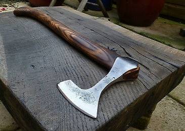 Discover the power and craftsmanship of this Custom Viking Styled War Axe, a unique battle-ready axe crafted from a vintage steel head dating back to circa 1950. The head has been meticulously cleaned, custom-shaped, smoothed, and polished, finished with a matt satin texture, and the cutting edge sharpened to precision. The ergonomic handle is hand-crafted from seasoned ash wood with a straight end grain, fire-colored, and treated with teak oil and beeswax for superior grip and shine. The handle measures 20 3/4 inches, perfectly balanced for control, while the poll to bit measures 5 1/2 inches and the cutting edge 3 3/4 inches.Included is a custom thick full-grain tooling leather sheath secured with black domed rivets and a gunmetal steel popper. The axe weighs 1lb 1.5oz, making it light, fast, and easy to manipulate while remaining devastatingly effective. Each axe is made from vintage and antique heads, brought back to life with care and attention to detail. The hand-made handles are expertly balanced and fit for actual use, giving this axe both functional strength and collectible appeal. Ready for work, display, or reenactment, this Viking axe embodies authenticity and precision.