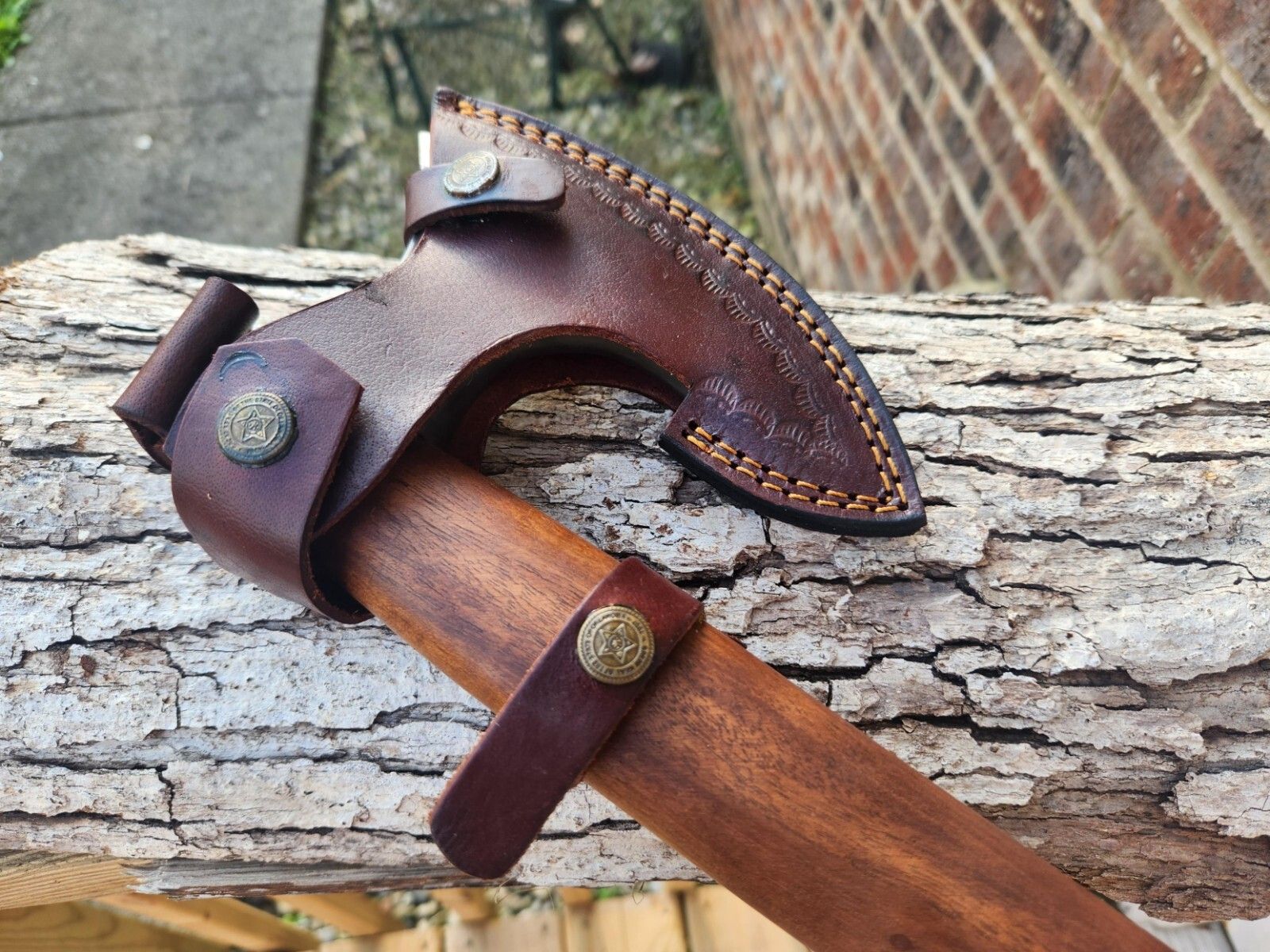This handcrafted Viking axe combines traditional design with practical functionality. The high-quality carbon steel blade features unique carbon patterns on the axe head, giving it a distinctive look while maintaining durability and sharpness. The handle is made of solid wood, ensuring a comfortable and secure grip for handling and display. Measuring 19 inches in overall length, this versatile axe serves as both a collectible and a functional tool. It is perfect for outdoor activities, camping, or as a unique addition to any Viking or medieval collection. Each piece reflects expert craftsmanship, designed to be both visually striking and reliable for practical use.