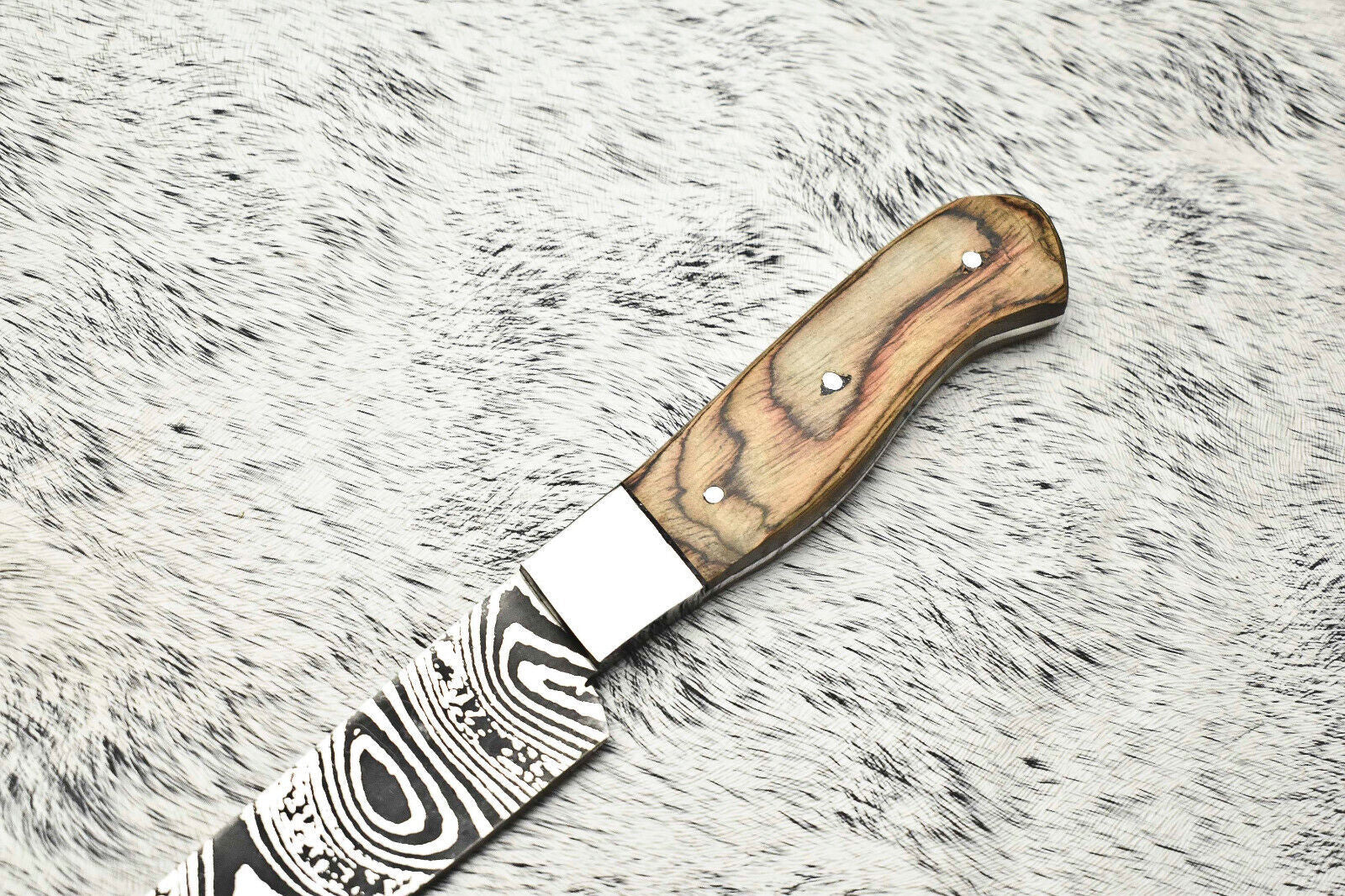 All our Damascus steel is authentic and not just an acid etch. It is crafted by combining 1095HC and 15N20 nickel carbon steels, heated and folded repeatedly to create 384 layers. The blade is then acid-bathed, turning the nickel to a satin color and the high carbon steel to blackish gray. This process exposes the distinctive layered Damascus pattern. Acid etching reveals these layers, and high polishing the metal gives a shiny satin finish like all steels. Only after acid burning the blade sides do the two steel layers become visible.After crafting, we high polish the handles and sharpen the blade edge. The polishing removes the acid layer from the handle, while the blade edge remains sharpened with a satin finish.All our knives are 100% handmade with no CNC machining used, ensuring each knife is unique and crafted with care.