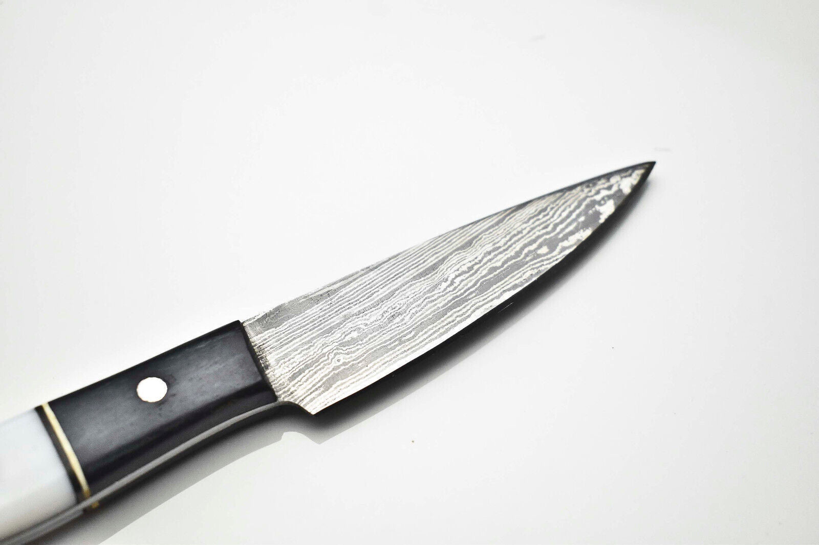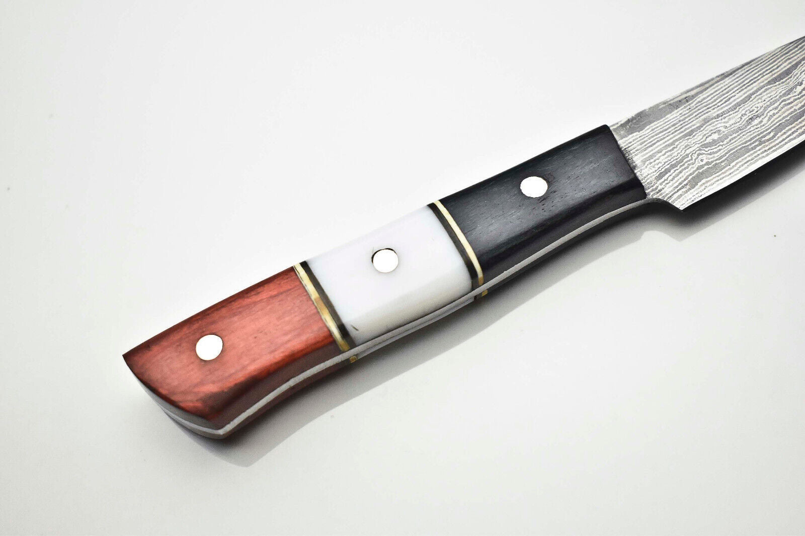 The Cutlery Salvation Handmade Damascus Steel Full Tang Chef Knife is a compact powerhouse for precise kitchen tasks. Measuring 7.0 inches overall, this premium blade is oil-tempered to 58–60 HRC and sharpened at a 20° angle for exceptional cutting performance.Crafted from genuine Damascus steel, not an acid etch, it combines 1095HC and 15N20 nickel carbon steel, folded 384 times for superior durability and a stunning layered pattern. The blade undergoes an acid etch to reveal the iconic contrast between satin nickel and dark carbon steel.Each knife is meticulously hand-polished, with a comfortable, high-shine handle and a satin-finished edge. What you see in the photos is exactly the knife you’ll receive—an authentic, one-of-a-kind culinary tool designed for professionals, collectors, and passionate home chefs.