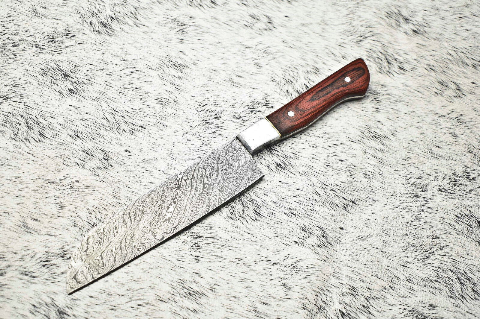 Upgrade your kitchen with the Cutlery Salvation Handmade Damascus Steel Full Tang Chef Knife, boasting a 12-inch blade expertly crafted from a blend of 1095HC and 15N20 nickel carbon steel folded 384 times to create authentic Damascus layers. The blade undergoes acid etching to reveal the striking contrast between satin nickel and blackish-gray high carbon steel. Oil-tempered to 58-60 HRC and sharpened precisely at a 20-degree angle, this knife offers exceptional sharpness and durability. The handle is hand-polished to remove acid burn, ensuring a comfortable grip and elegant finish. Each knife is 100% handmade, delivering a unique, high-quality culinary tool. The knife shown in the photos is exactly what you will receive.